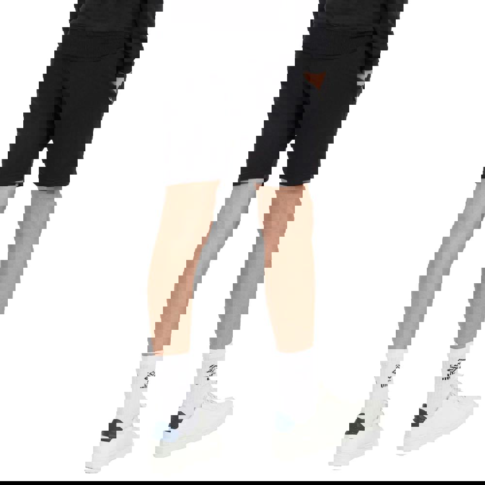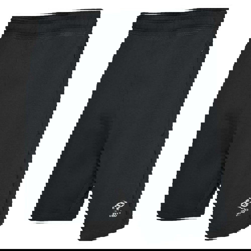 Umbro Kids Club Leisure Shorts in black and white combine a cotton and elastane blend with practical detailing. The design includes a stacked logo and a ribbed waistline for a defined finish. Two side pockets add everyday storage, while a branded zip pull provides a clear Umbro detail.