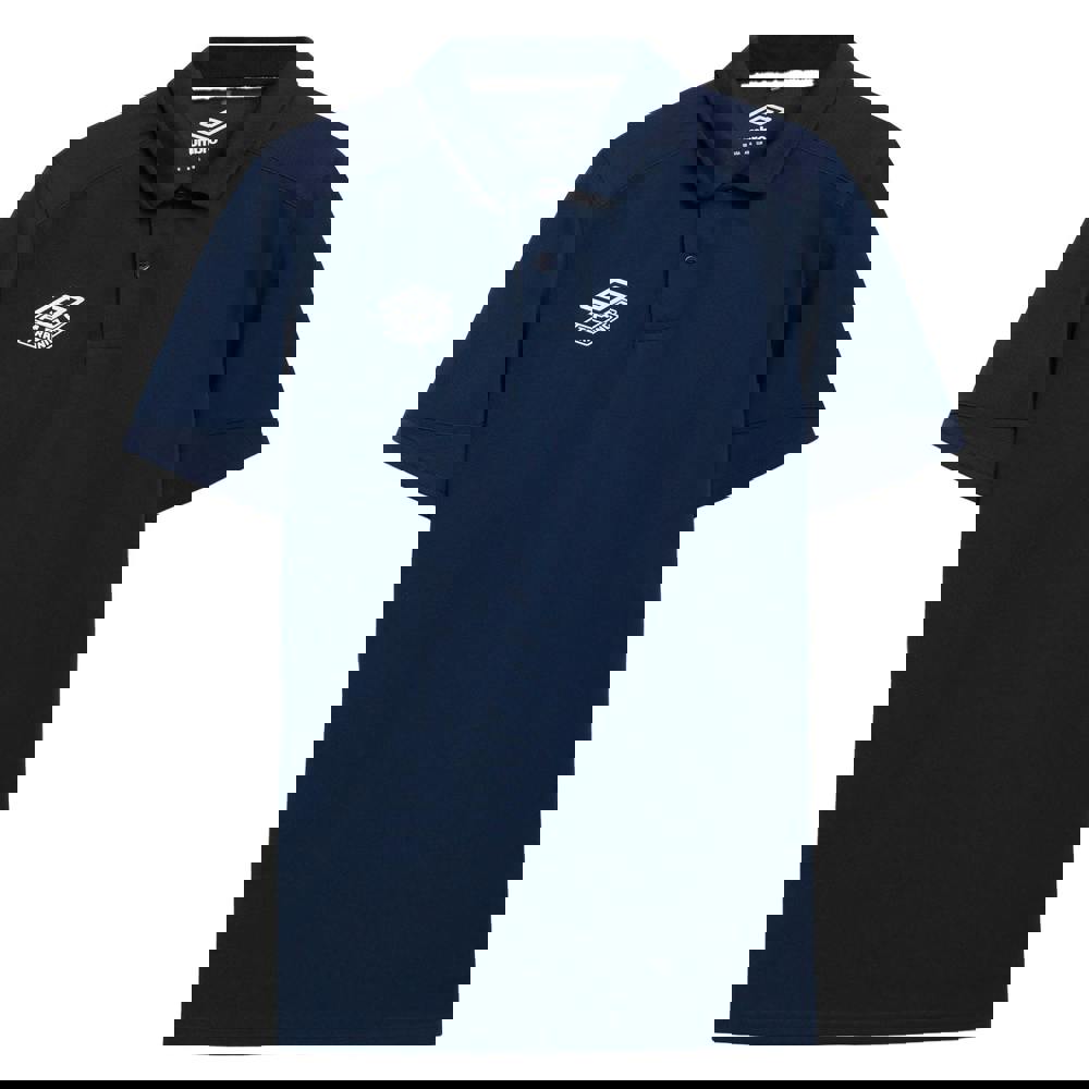 This kids’ training polo shirt from Umbro comes in navy with a collared neckline and short sleeves. Made from 100% polyester in a piqué fabric, it has a lightweight feel and a regular fit. The front uses a pull over style with a two-button placket for a classic polo finish.