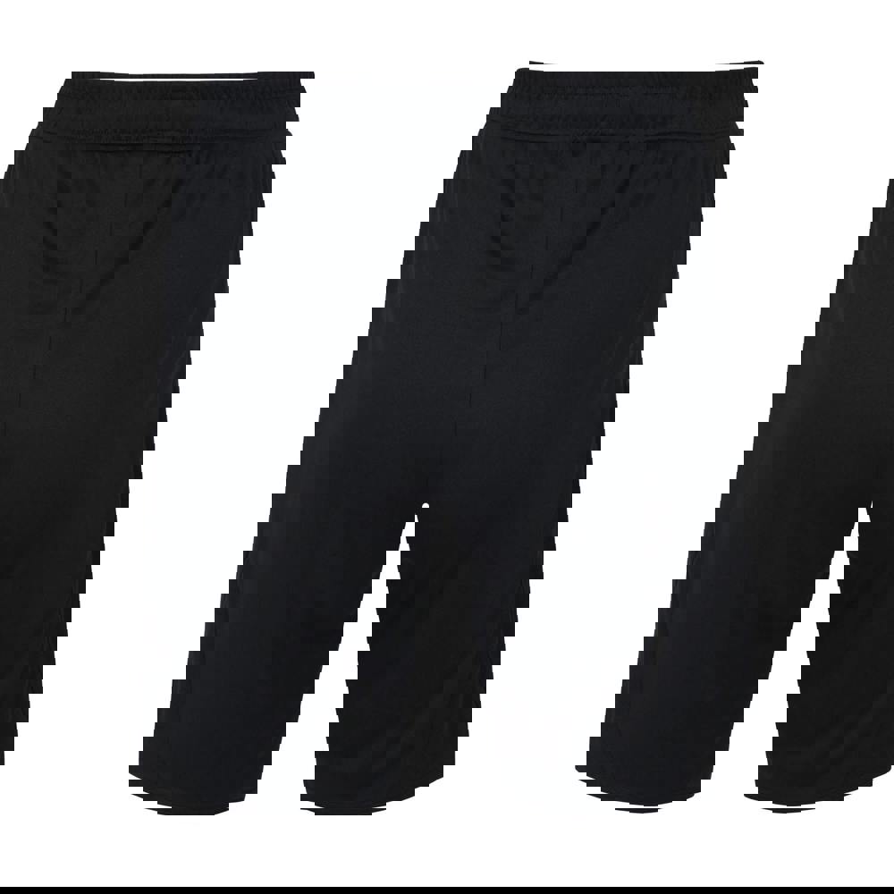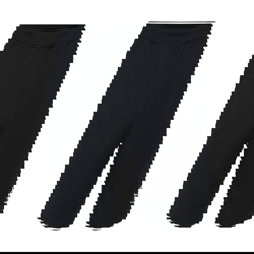 Umbro Kids Optimus Training Shorts in black with a silicone logo and tonal panel insert. The pull-on design includes an inner drawcord at the waistline for adjustment. Two side pockets provide storage, with a zip detail included.