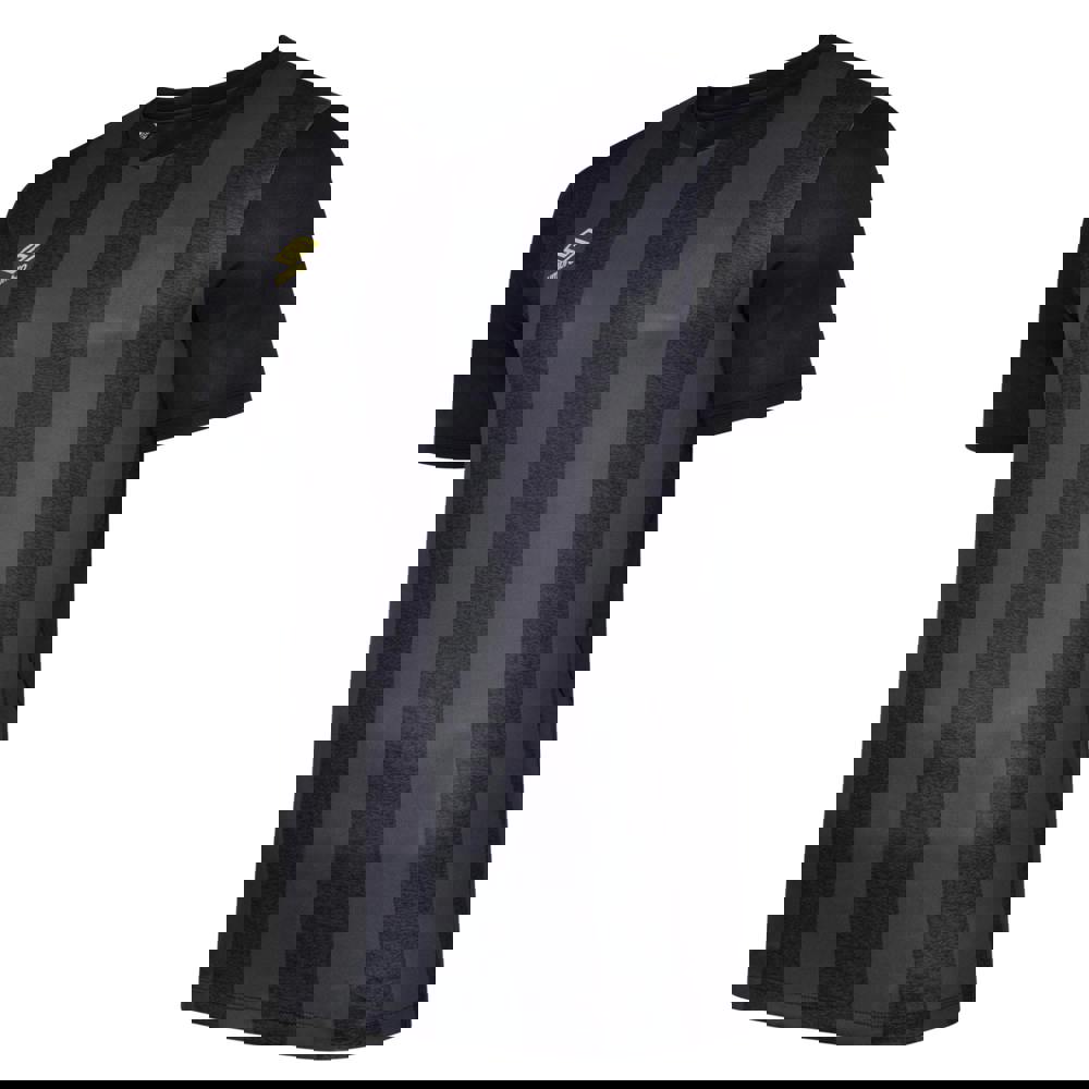 Umbro Kids Ramone Jersey in black/carbon is made from 100% polyester with a lightweight fabric technology. The design combines logo detailing with marl and stripe elements, finished with curved panels for a defined look. A self-fabric V neck and short sleeves complete the classic jersey shape.