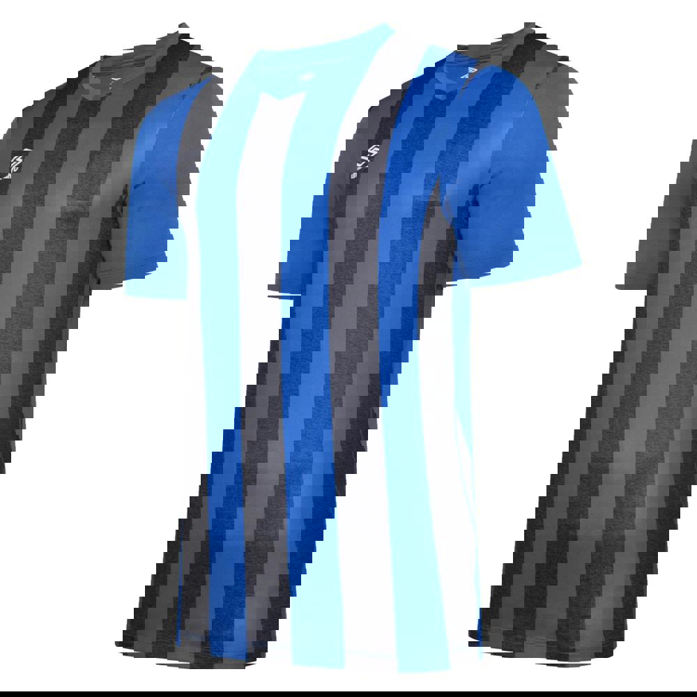 This kids’ Ramone jersey from Umbro comes in royal blue and black, with a marl and stripe design and logo detailing. Lightweight fabric keeps the finish streamlined, while curved panels add shape to the overall look. A self-fabric V neck and short sleeves complete the classic jersey silhouette.