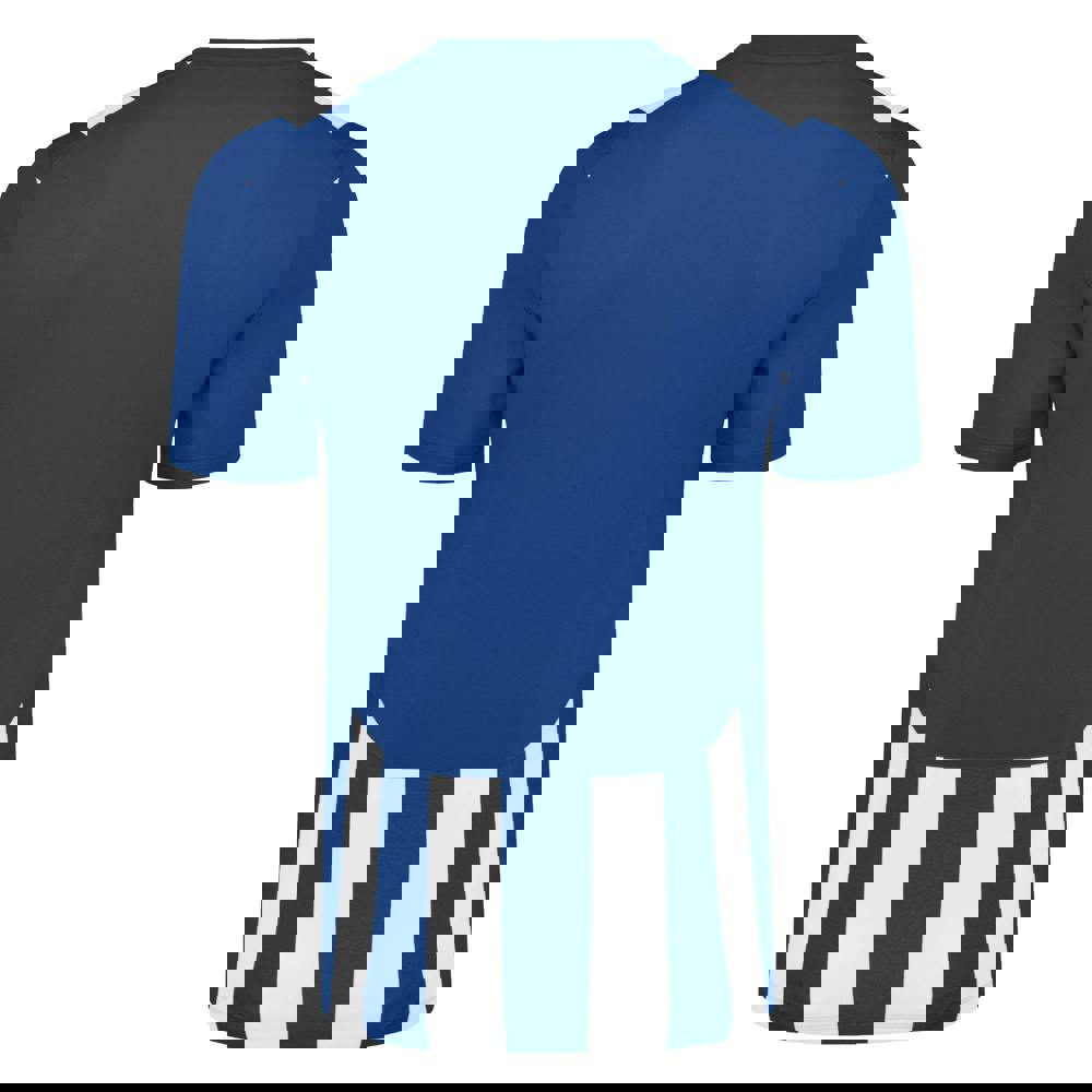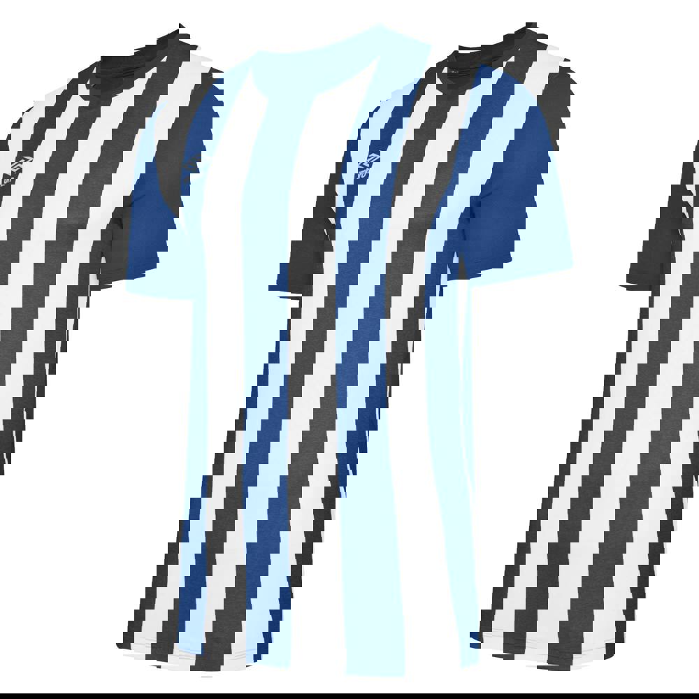 The Umbro Kids Ramone Jersey comes in royal blue and white with a marl and stripe design and logo detailing. Made from 100% polyester, it uses lightweight fabric technology for a comfortable feel. A V neck with self-fabric neckline and short sleeves create a clean, sporty finish, while curved panels add shape to the overall look.