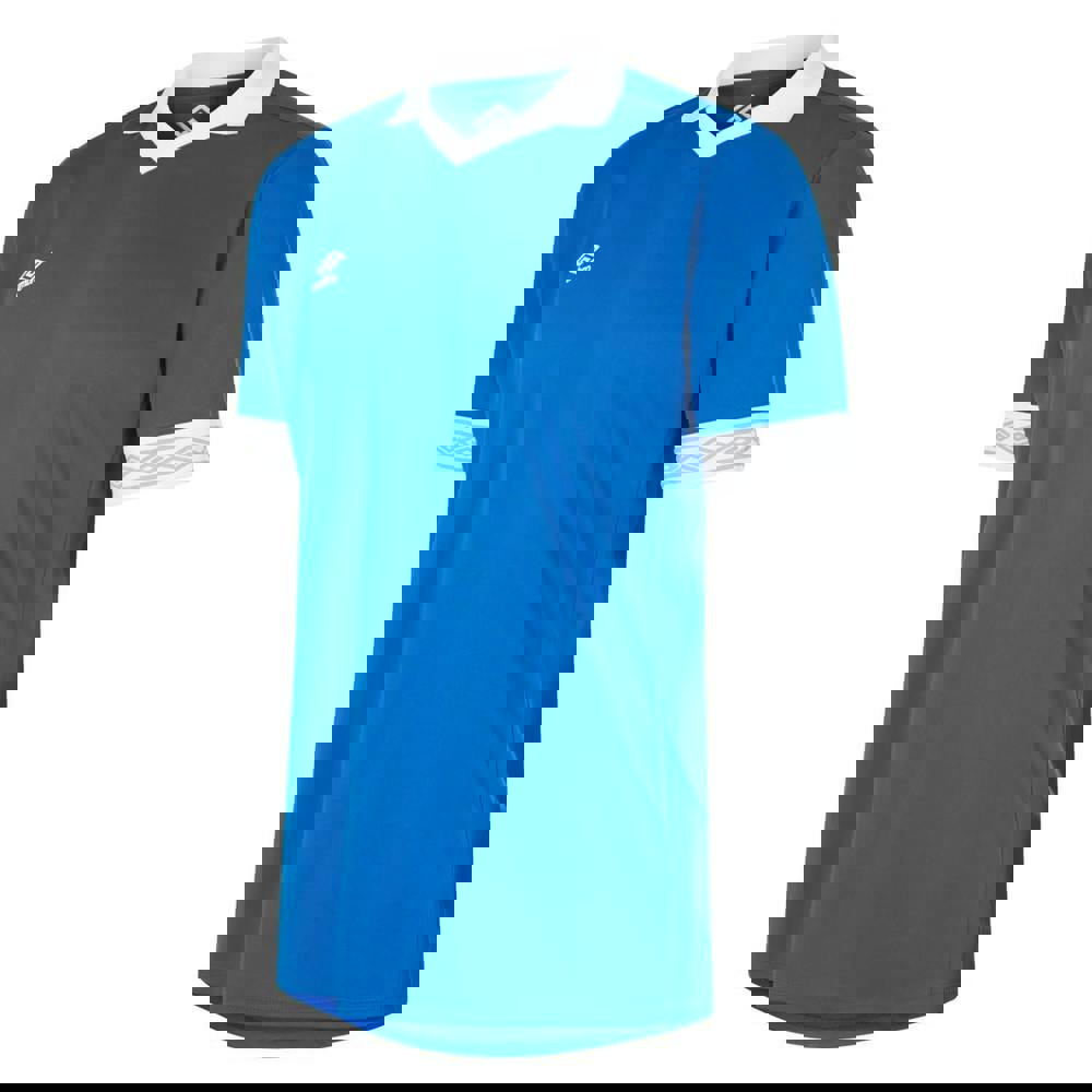 This kids’ Tempest jersey from Umbro comes in royal blue and white with a contrast finish. It uses micro eyelet and micro mesh fabric, with a lightweight construction. The design includes a diamond detail and a stacked logo.