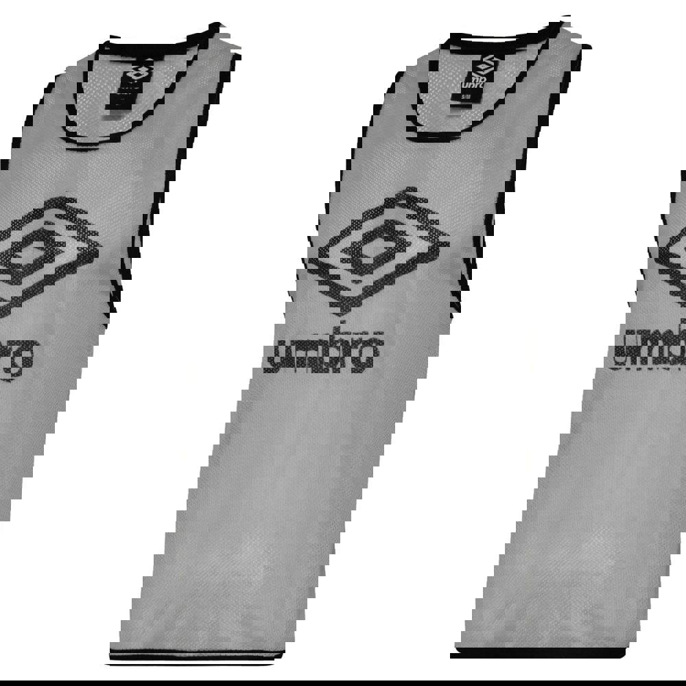 The Umbro Kids Training Bib is a sleeveless training layer designed to be worn over sportswear during practice sessions. Finished in High Rise Grey/Black, it features a stacked logo design and contrast binding for a clean, sporty look.