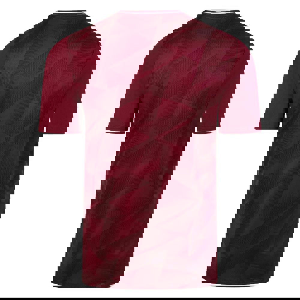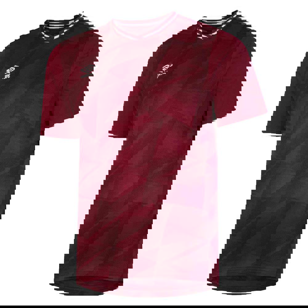Umbro Kids Triassic short-sleeved jersey in claret red and tawny port. Made from 100% polyester with an interlocking fabric construction. The design includes a graphic print and logo, finished with a crew neck and ribbed neckline with a contrast stripe. Set-in short sleeves complete the silhouette.