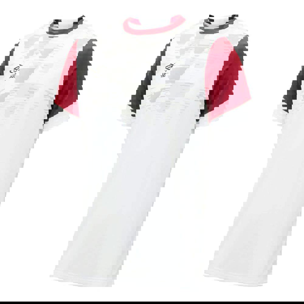 The Umbro Kids Vier Jersey comes in white/new claret with a graphic print and logo. A sublimated design adds detail across the fabric, while contrast elements bring definition to the overall look. The neckline combines a crew neck shape with a contrast collar in self fabric, keeping the finish clean and consistent.