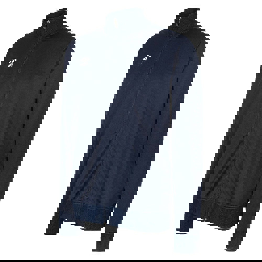 Cut from 100% polyester, this Umbro Club Essential jacket comes in dark navy with a stacked logo design. It has long sleeves and a standing collar with a ribbed finish for a clean, structured look.