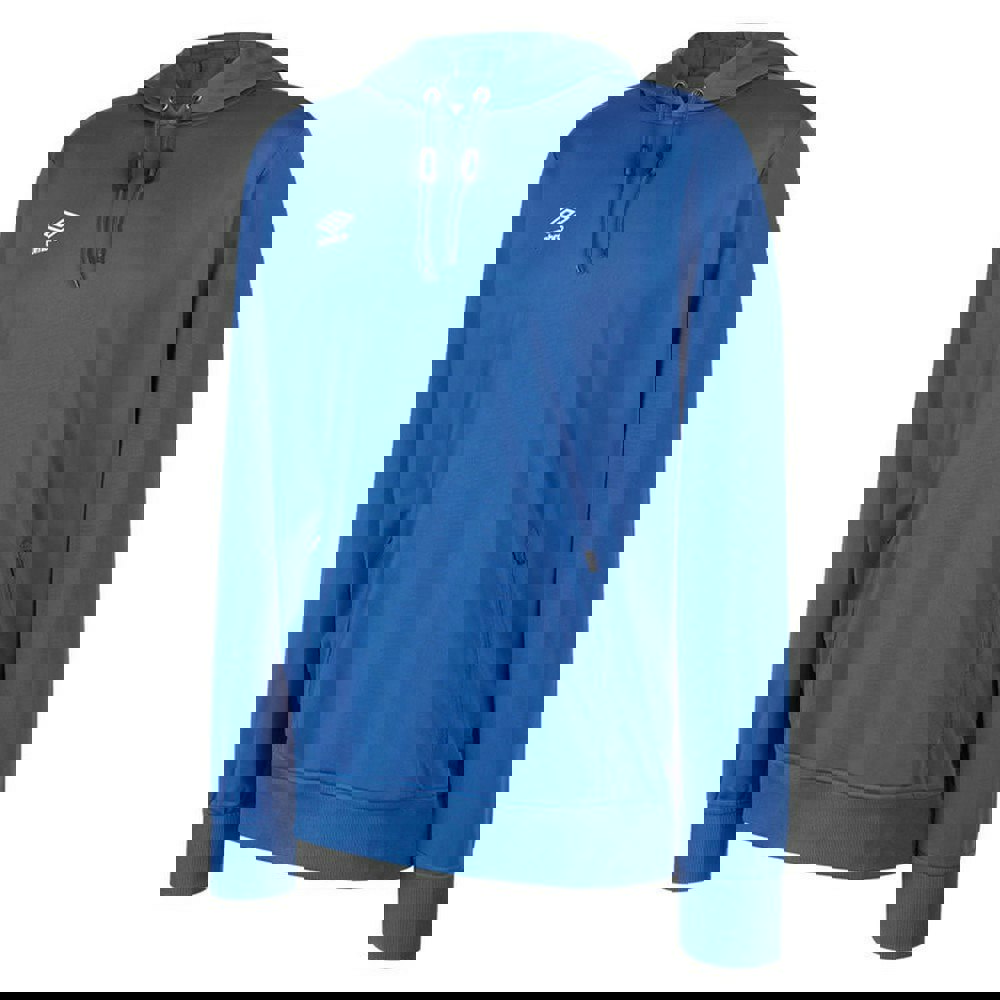 This Umbro Club Essential hoodie is made from 100% polyester and finished in royal blue with a stacked logo design. It has a hooded neckline with a 3-piece hood construction and branded eyelets for the drawcord.