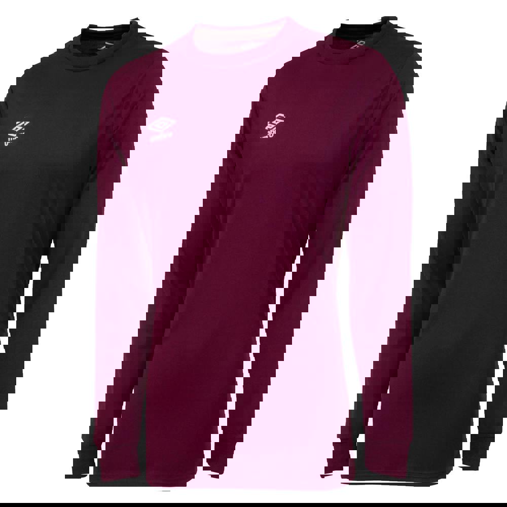 Umbro Club long-sleeved jersey in new claret. Made from 100% polyester micro eyelet fabric, it has a logo design and a classic crew neckline with ribbed detailing. The long sleeves are finished with fitted cuffs, and the pull-over construction keeps the look clean and simple for everyday wear.