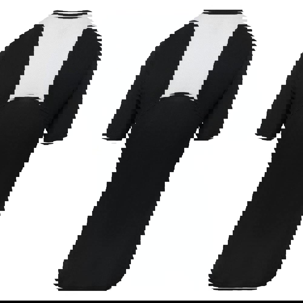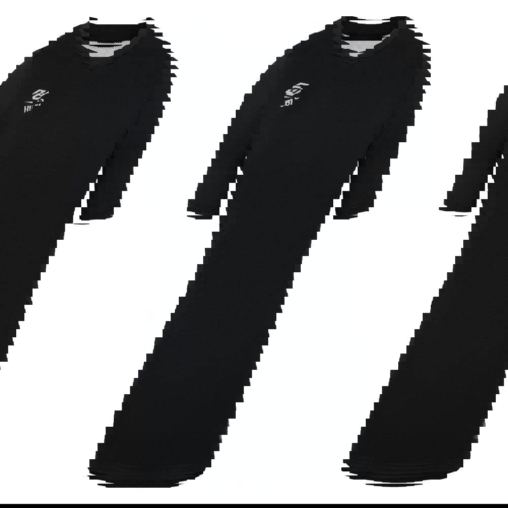 Umbro Elite base layer top in black with a V neck and short sleeves. The design combines contrast panels with a stacked logo, supported by ergonomic seams and side seams for a structured finish. Ventilated construction is paired with a mesh back panel, while stretch panels add flexibility through the body.