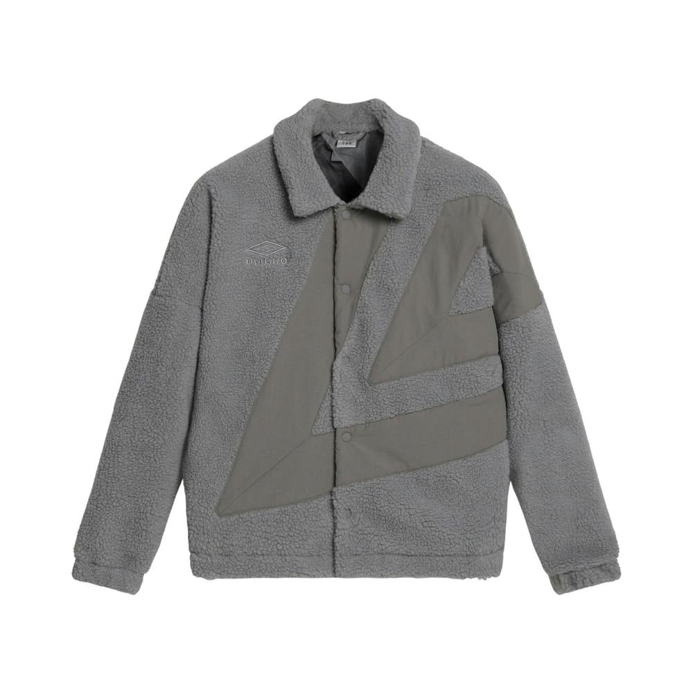 This men’s fleece coach jacket from Umbro combines sherpa fleece and taslan fabric with a taffeta lining. It has a boxy fit with long drop sleeves and a turn down collar for a clean, structured look.