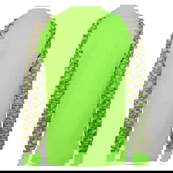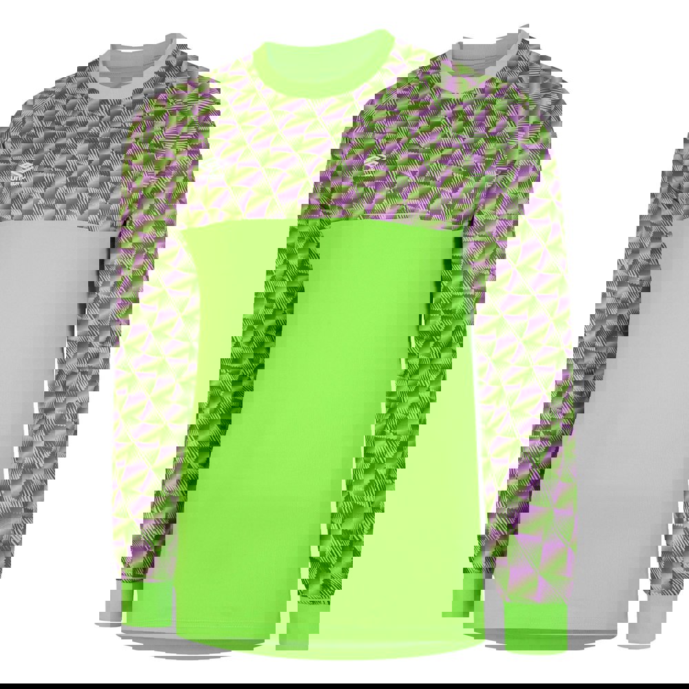 Umbro Flux long-sleeved goalkeeper jersey in Green Gecko/Purple Cactus. Made from 100% polyester with a performance fabric construction and a lightweight feel. The design combines a logo detail with a patterned finish for a distinctive look on the pitch.