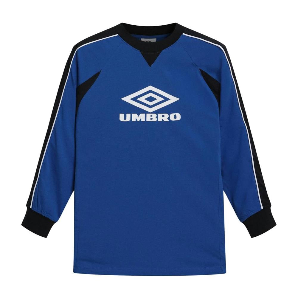 This long-sleeved T-shirt from Umbro comes in classic blue, black and brilliant white. It has a crew neckline with ribbing, paired with raglan sleeves for a clean, sporty outline. The design uses contrast panels and contrast piping, finished with a logo detail.