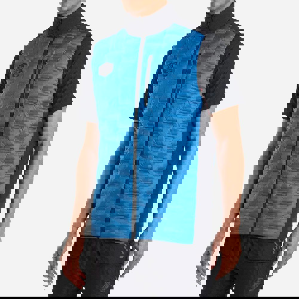 This reversible hybrid gilet is made from a cotton, elastane and polyester blend, using 4 way stretch taffeta and twill. Quilted construction with stitched baffles and padded sections is paired with heat sealed details, contrast panels and a badge design. A standing collar and sleeveless cut keep the profile clean for layering.