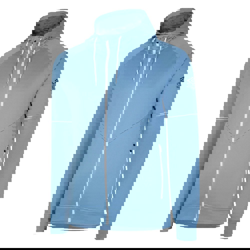 This Umbro Pro Training full zip hoodie is made from polyester and elastane in a 66gsm woven fabric. It has a hooded neckline with a mesh-lined hood and long sleeves, finished with stretch cuffs and a stretch hem.