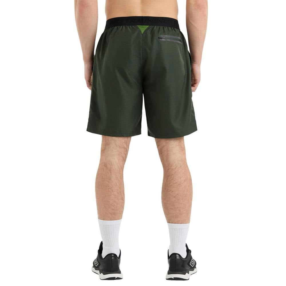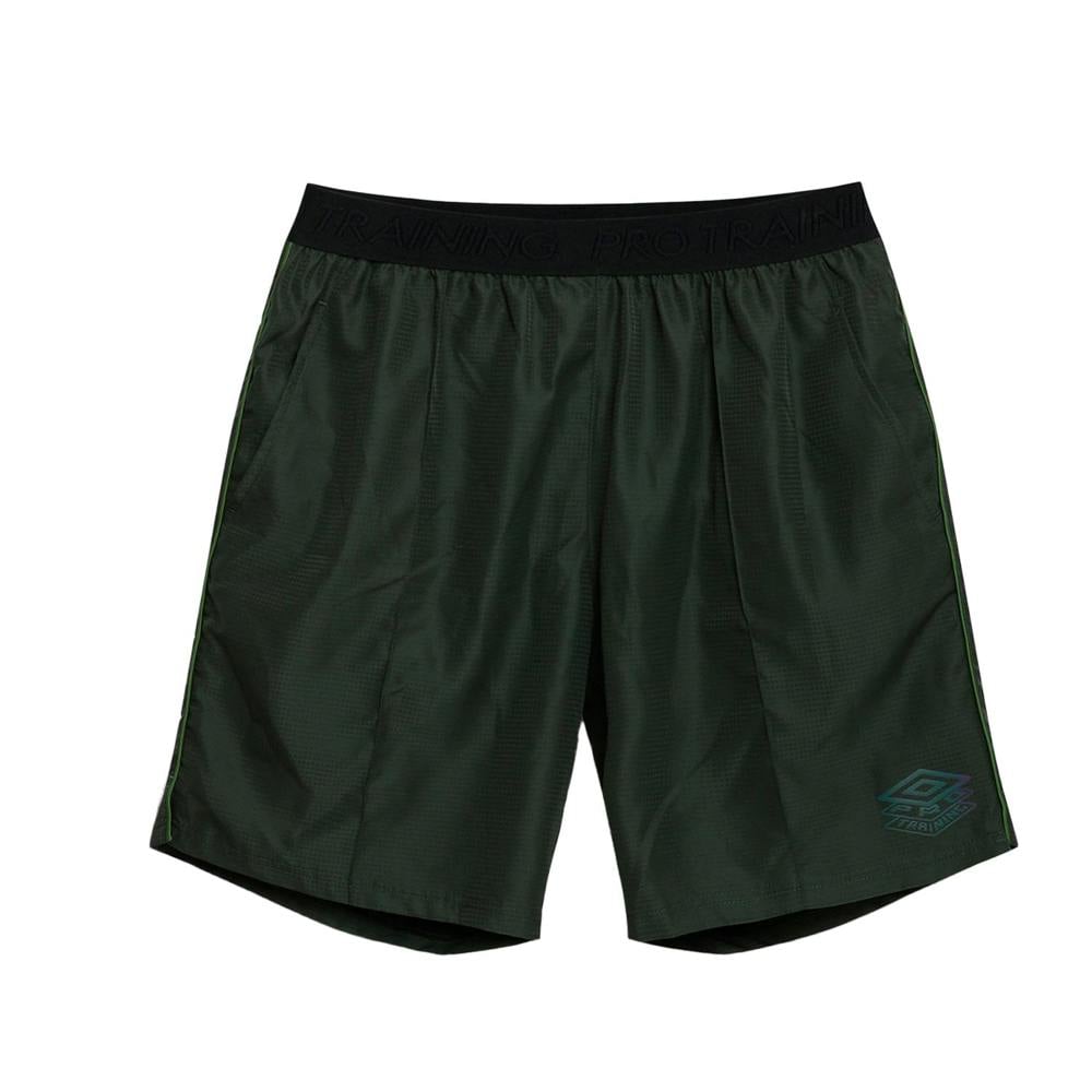Umbro Pro Training woven shorts in Deep Forest/Cactus, made from 100% polyester. The construction combines mesh, ripstop and woven fabric, with a 66gsm weight. A logo design and contrast piping add a clean, sporty finish, while side seams and a ribbed V insert complete the structure.