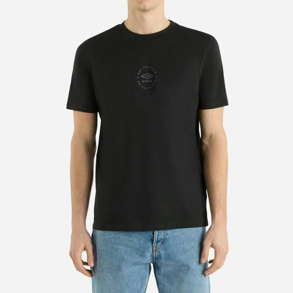 This men’s Umbro T-shirt comes in black and is made from 100% cotton in single jersey fabric. It has a relaxed fit with a crew neck finished with ribbing, plus short sleeves and a drop shoulder for a laid-back shape.