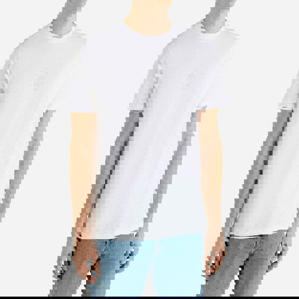 The design includes a screenprinted logo and text. A ribbed crew neckline and short sleeves keep the look classic, while the drop-shoulder construction adds a laid-back finish.