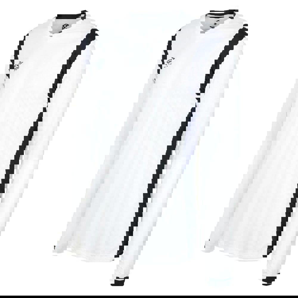 This long-sleeved jersey from Umbro is made from 100% polyester with a mesh micro eyelet warp knit construction. It comes in white and dark navy with contrast detailing and a stacked logo for a clean, graphic finish. A crew neckline and ribbed contrast cuffs give the design a structured look, while twin needle stitching adds a neat, durable edge.