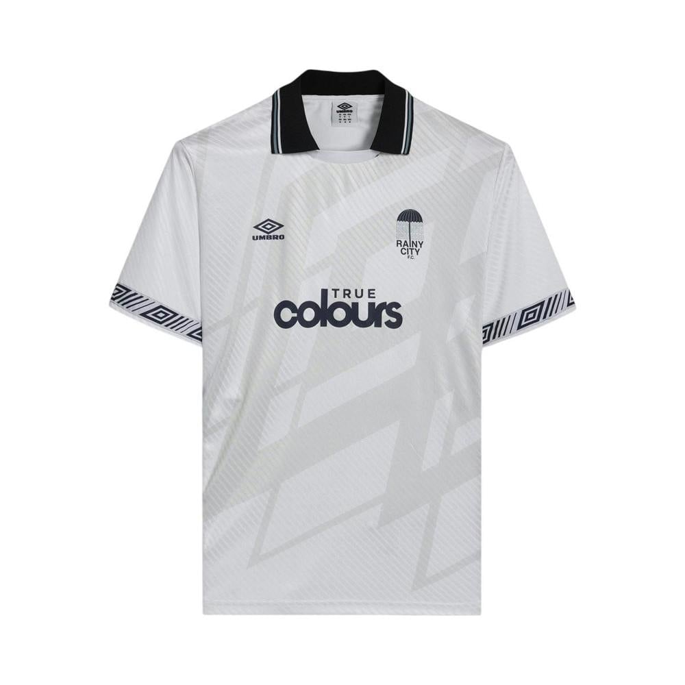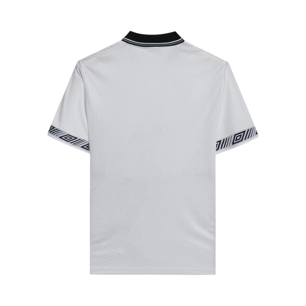 This Umbro men’s football shirt comes in Brilliant White with a flat knit and polyester jacquard construction. The design combines diagonal lines with logo and text detailing, finished with a mix of matte and shine effects. Short sleeves and a tipped turn-down collar keep the look classic and sport-focused.