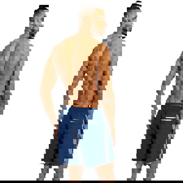 These Umbro men’s swim shorts are made from 100% polyester with a woven construction and a mesh, peached finish. The navy design includes contrast detailing, a diamond pattern and a logo, finished with contrast piping and taped leg detailing.
