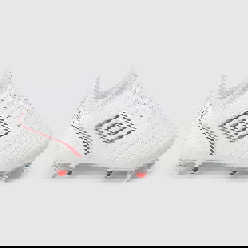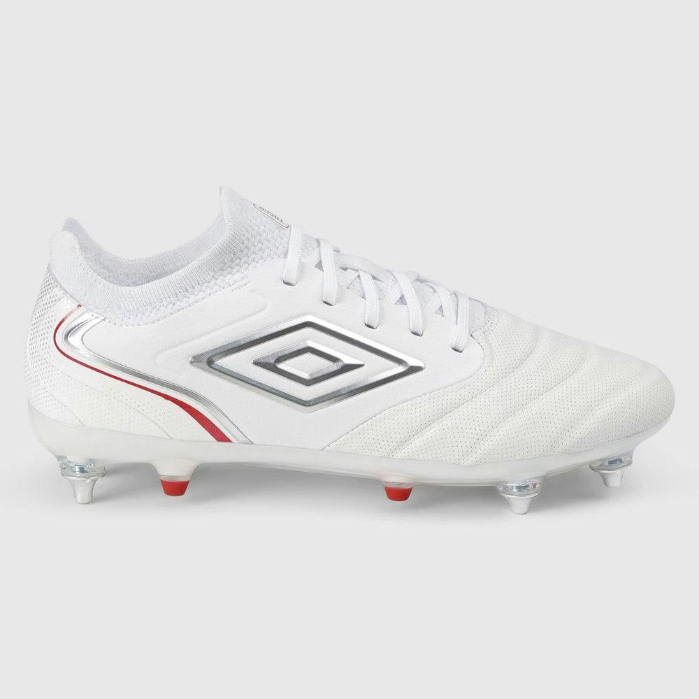 The Umbro Mens Tocco V Pro Soft Ground Football Boots are designed for soft ground play, with a lace-up fastening and a round toe for a classic football-boot shape. Finished in White/Silver/Equestrian Red, they feature contrast detailing and logo branding for a clean, modern look on the pitch.