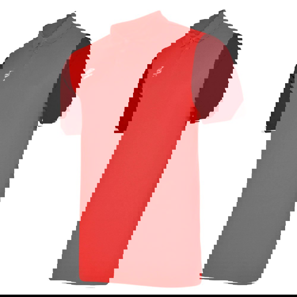 A self-fabric, turn-down collar and a two-button placket create a classic polo shape, secured with a button fastening. The colourway is listed as Vermillion/Biking Red/Black.