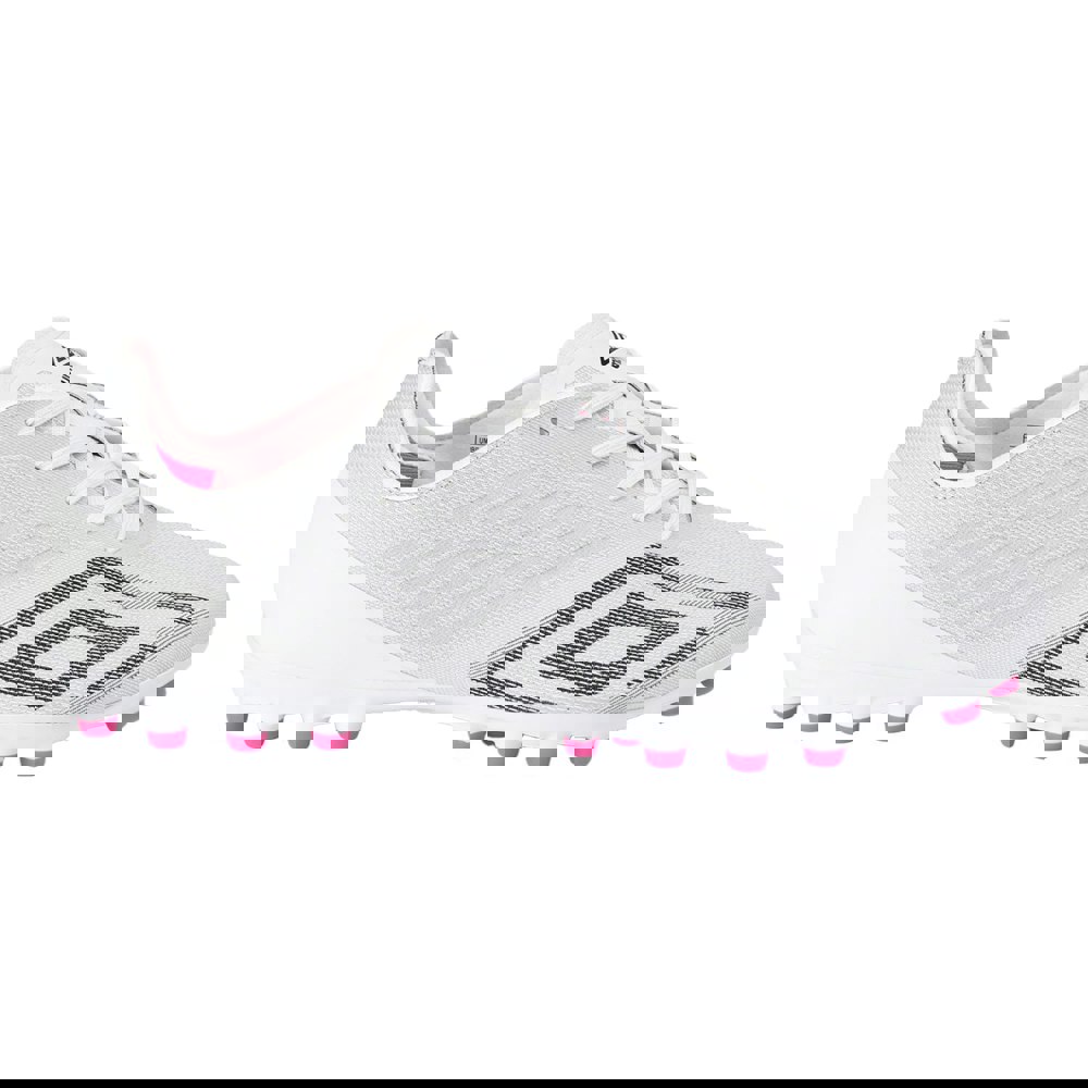 The Umbro Mens Velocita Decima Pro Artificial Ground Football Boots are designed for play on artificial ground, combining a low-cut profile with a lace-up fastening for a secure, adjustable fit. A round toe and flat sole shape keep the silhouette classic and streamlined, while the textured design adds a distinctive finish in white, black and pink glow.