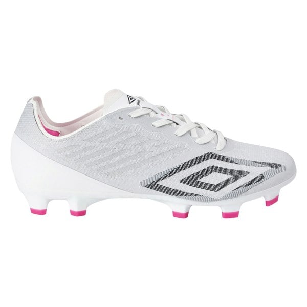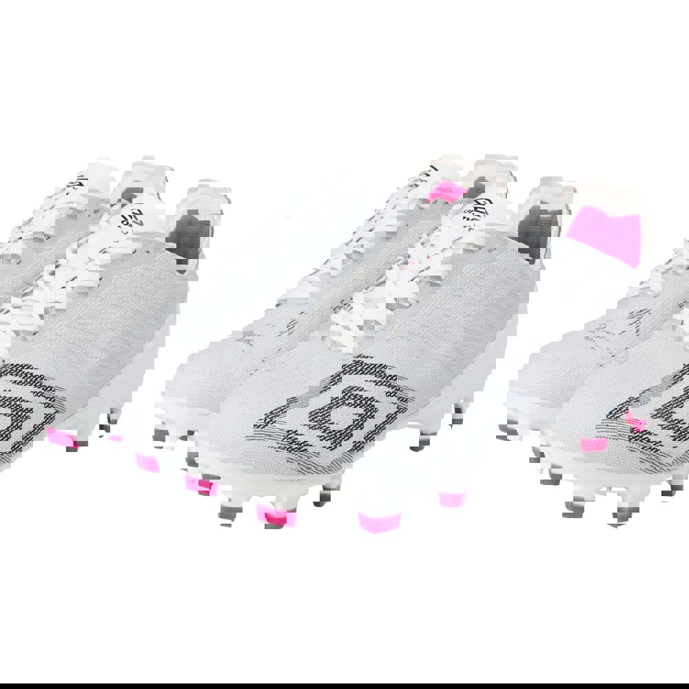 The Umbro Mens Velocita Decima Pro Firm Ground Football Boots are designed with a low cut and a round toe style for a streamlined fit. Finished in white, black and pink glow, they feature a textured look with logo detailing for a modern, sporty appearance.