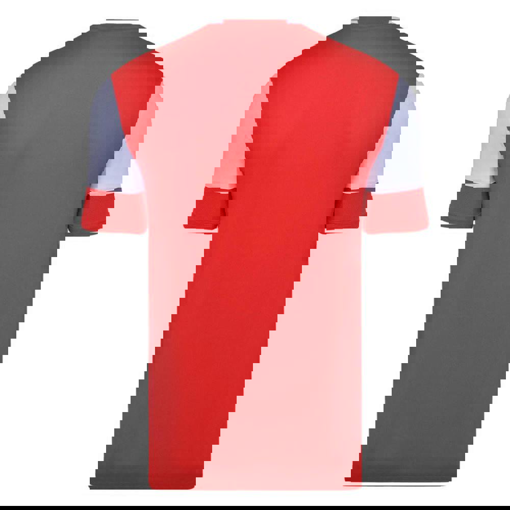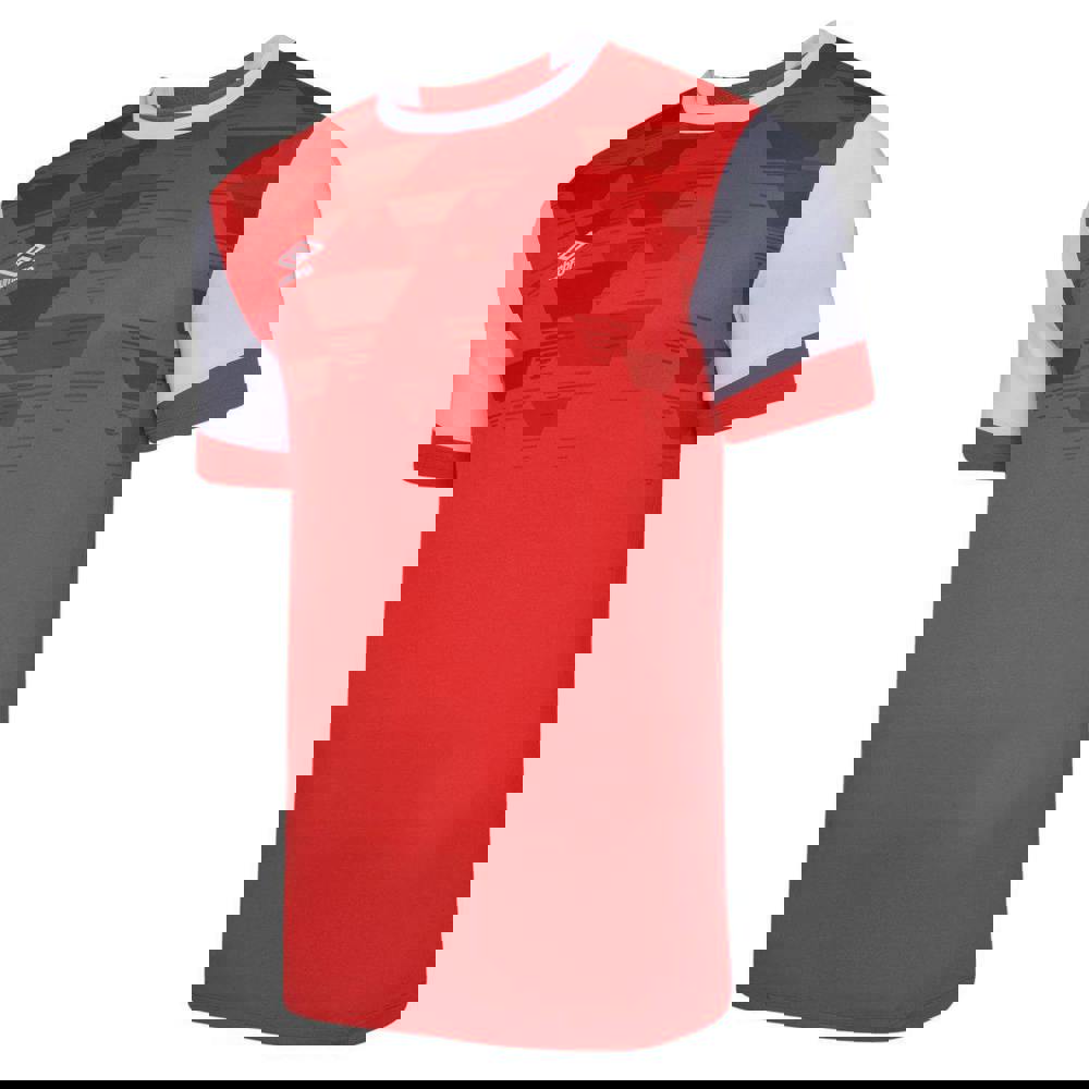 This Umbro men’s Vier jersey comes in vermillion and white with a graphic print and logo design. Made from 100% polyester, it has a lightweight feel and uses self fabric construction. A crew neck and short sleeves give it a clean, classic finish that suits casual wear.