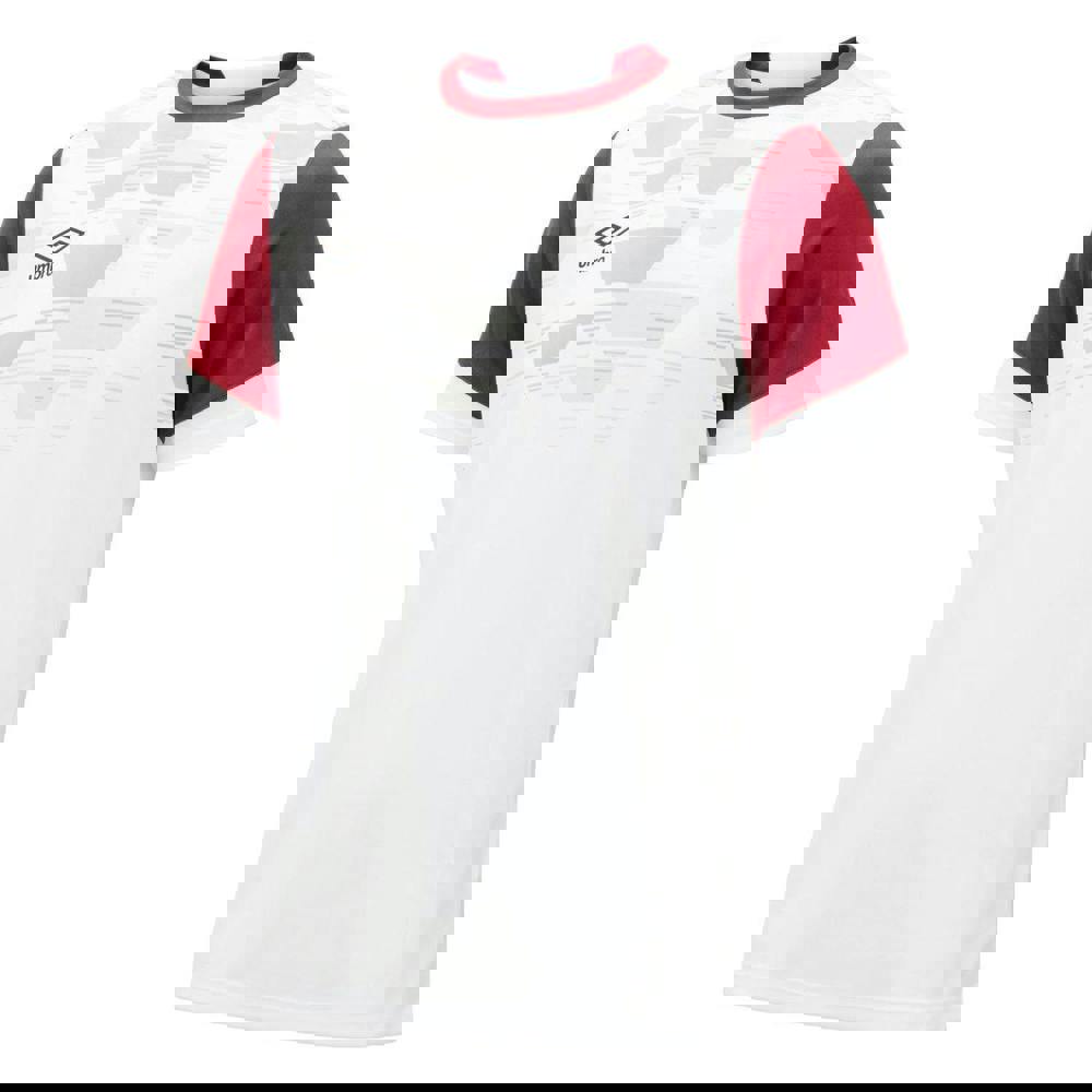 The Umbro Vier jersey is a short-sleeved top in white and new claret. It is made from 100% polyester with a lightweight feel, making it a practical option for everyday wear.