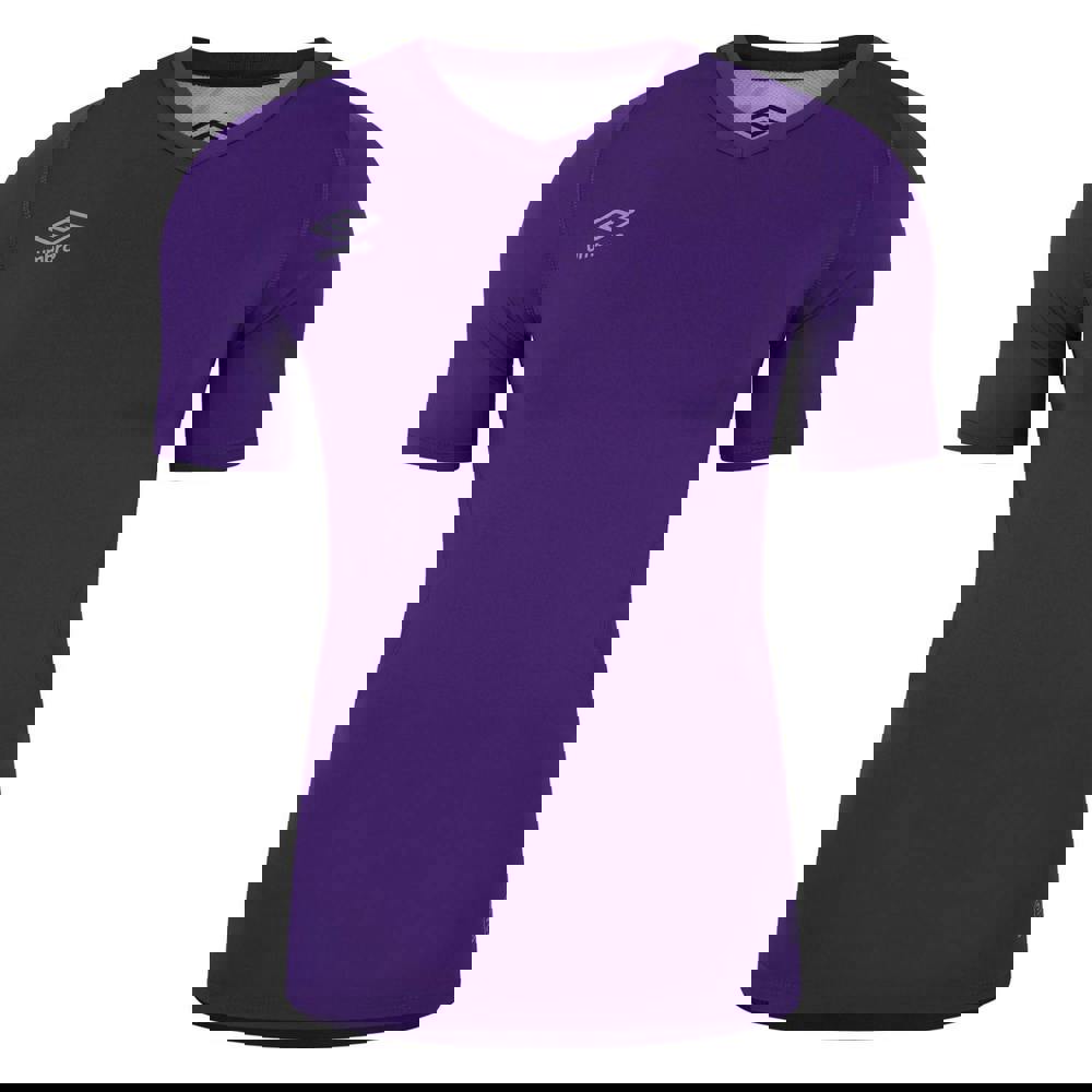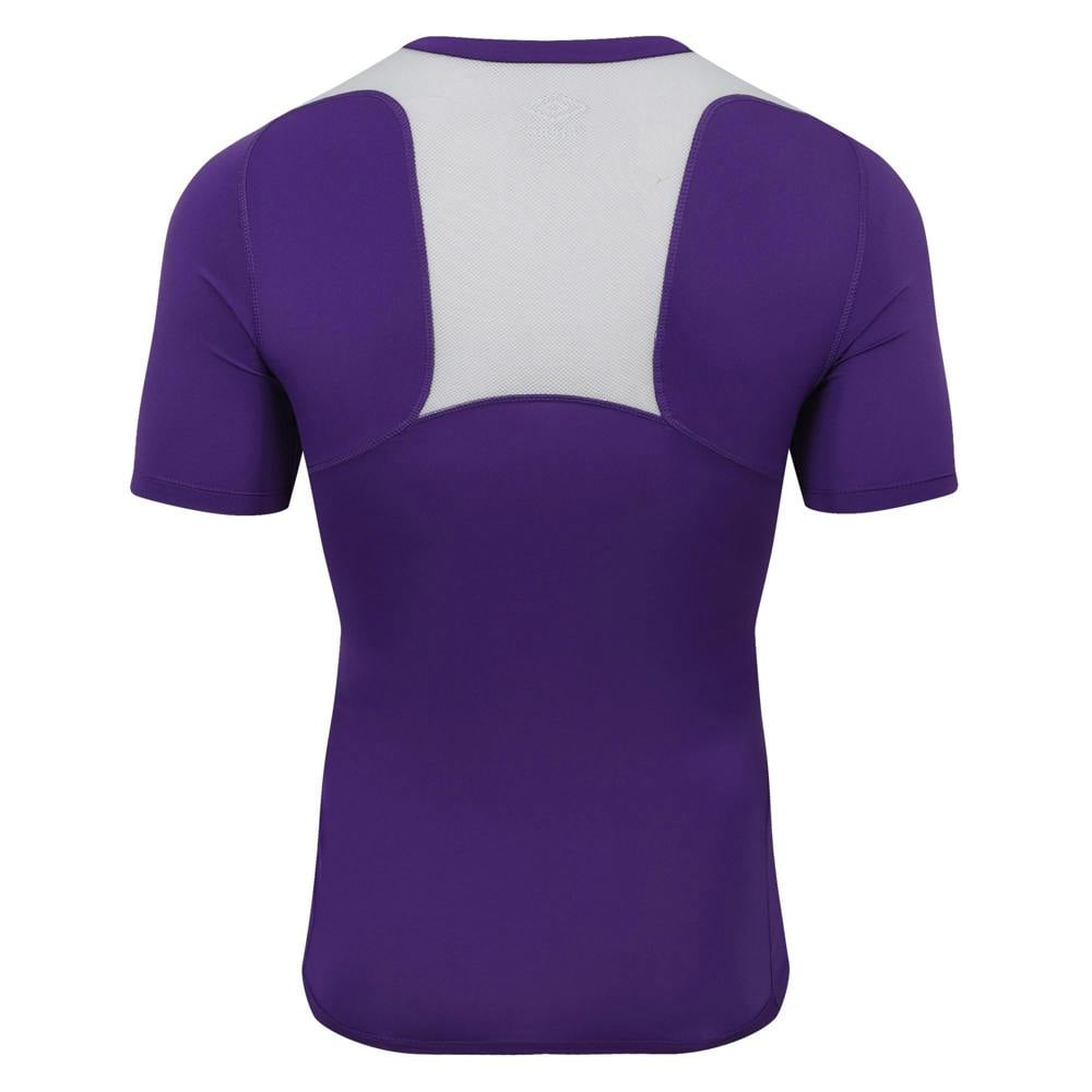 This unisex adult base layer top from Umbro is finished in bright purple with a stacked logo and reflective logo detail. It has a V neck and short sleeves, with ergonomic seams and flat locked seams for a clean, streamlined finish.