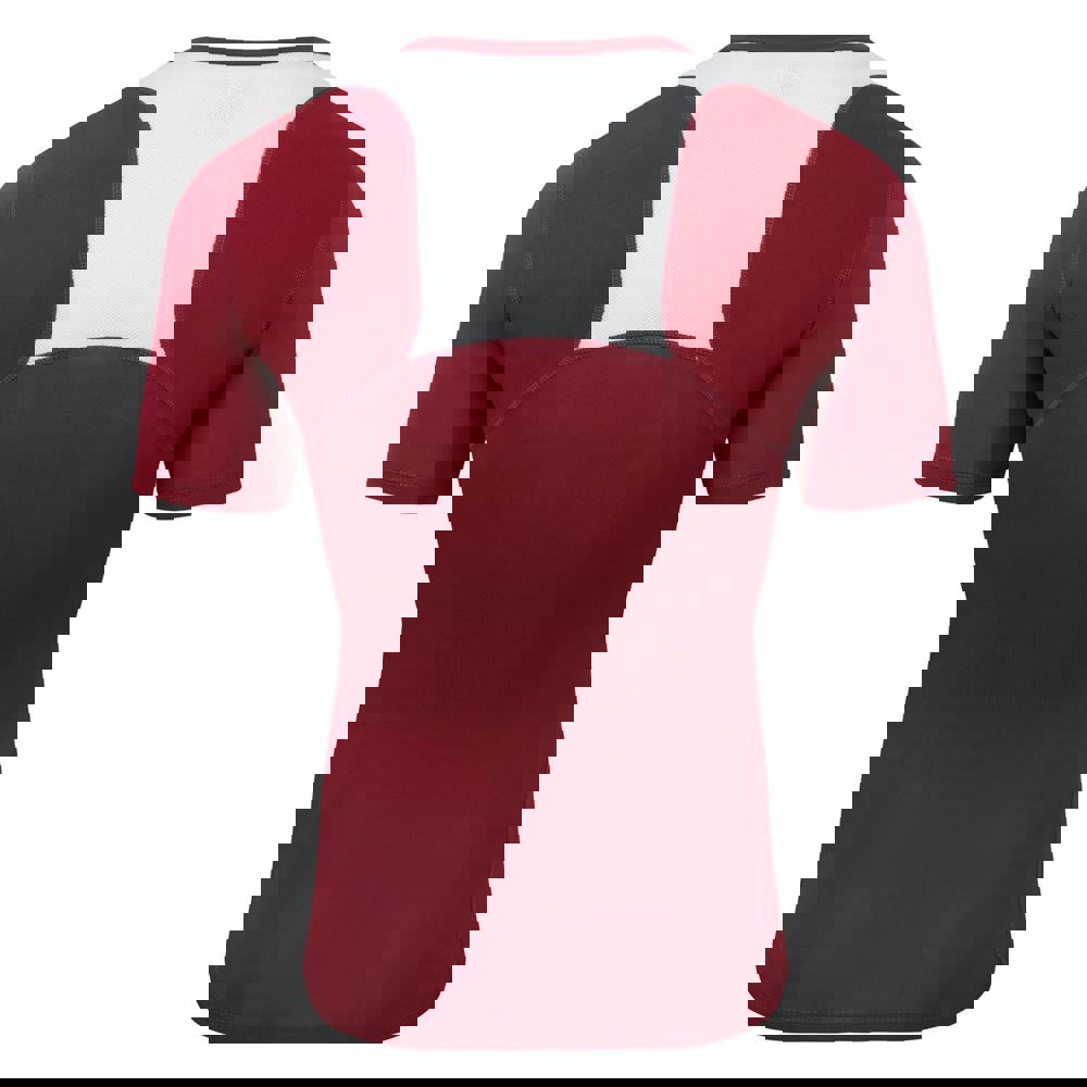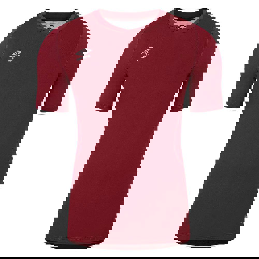 The Umbro Elite base layer top comes in New Claret with a stacked logo and reflective logo detail. It has a V neck and short sleeves, with ventilated fabric technology for a breathable feel. Ergonomic seams and flat locked seams create a smooth finish, while side seams support the overall shape.