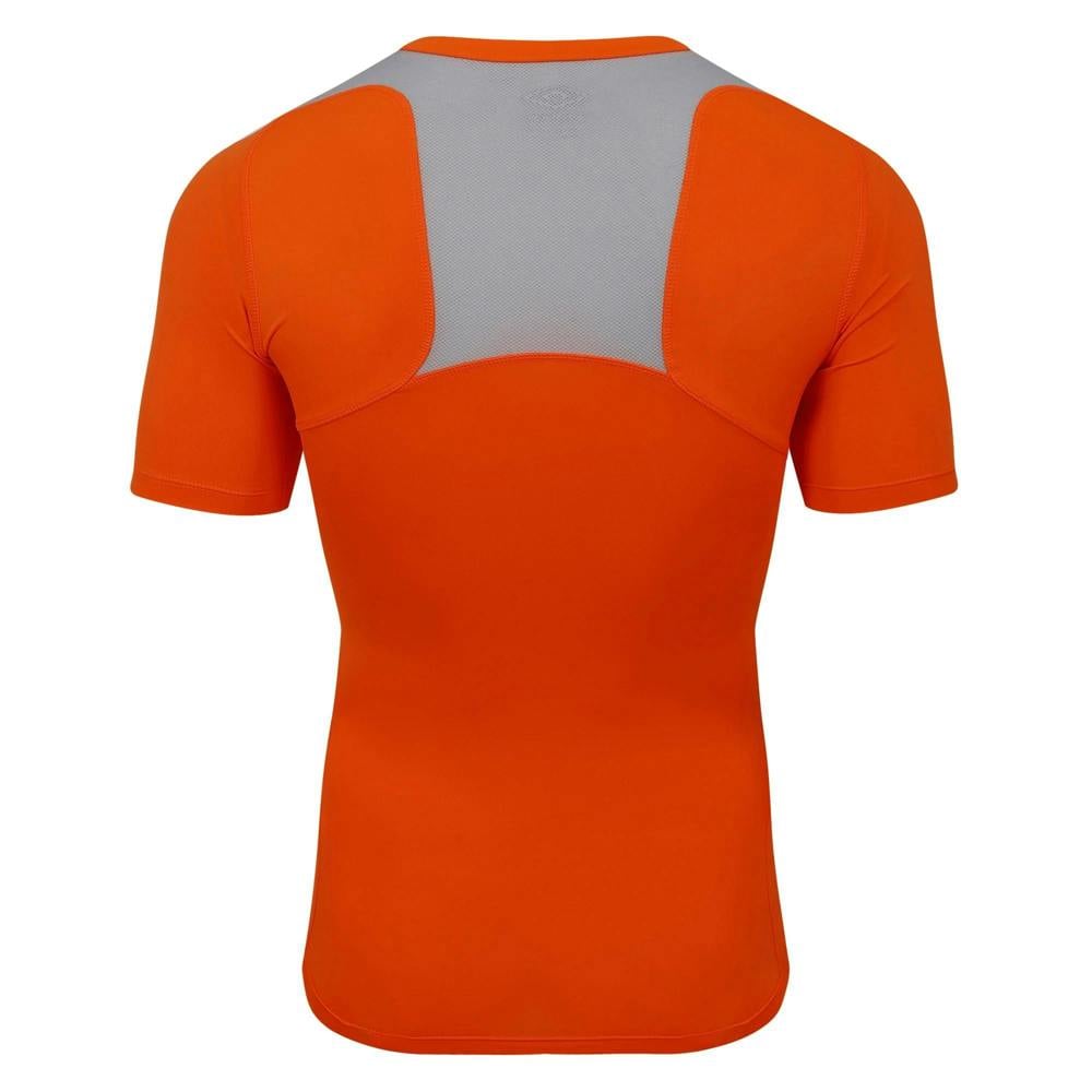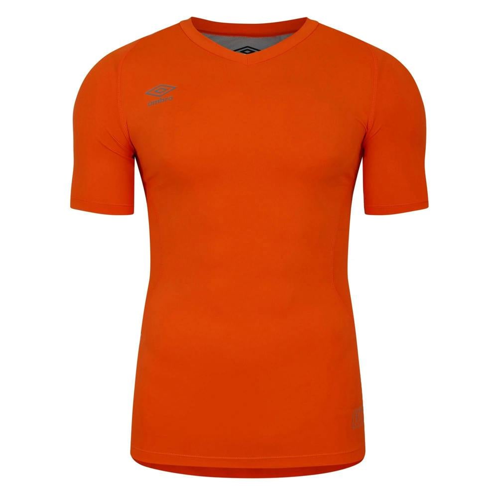 This unisex adult base layer top from Umbro is finished in Shocking Orange and uses a stacked logo detail. The short-sleeved cut and V neck keep the silhouette clean and easy to layer under training kit.