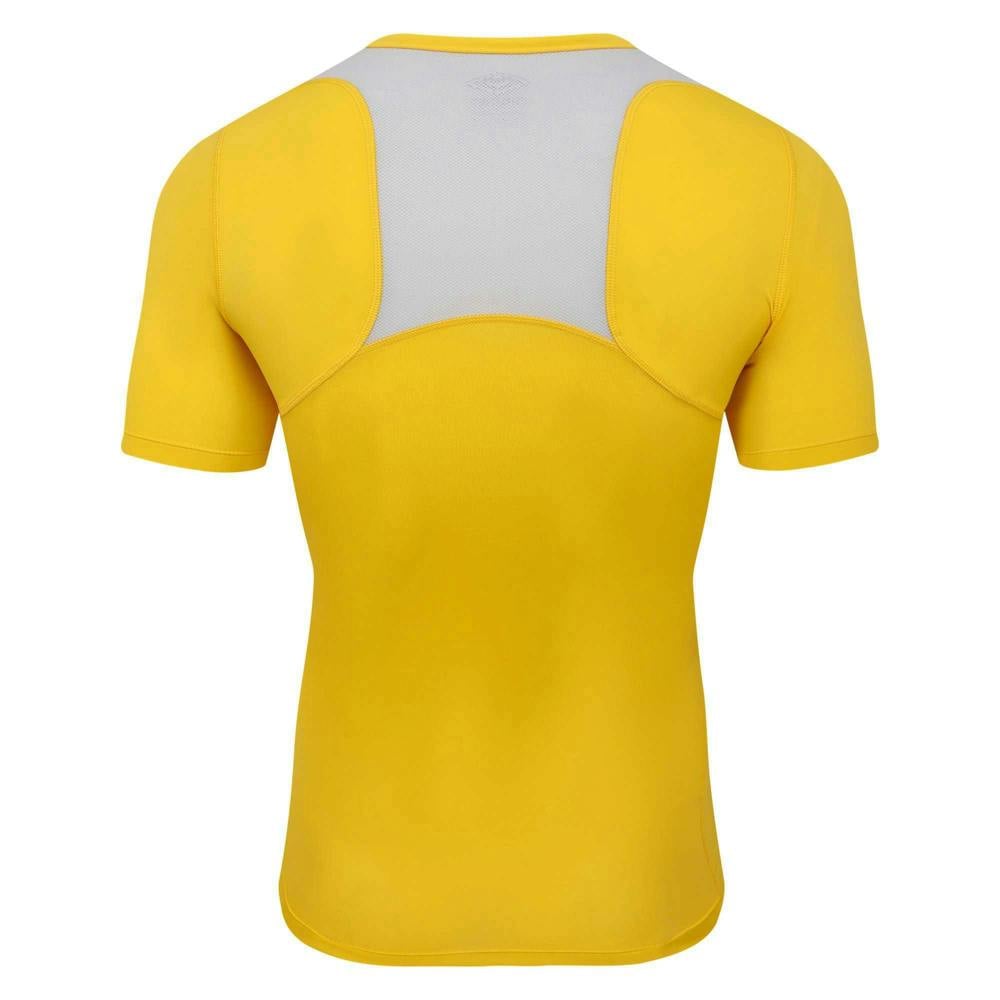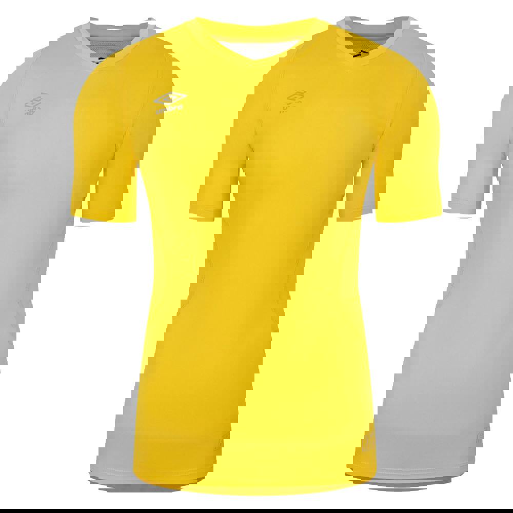 This unisex adult base layer top from Umbro is finished in yellow with a stacked logo and reflective logo detail. It has a V neck and short sleeves, with ergonomic seams and flat locked seams for a clean, streamlined finish.