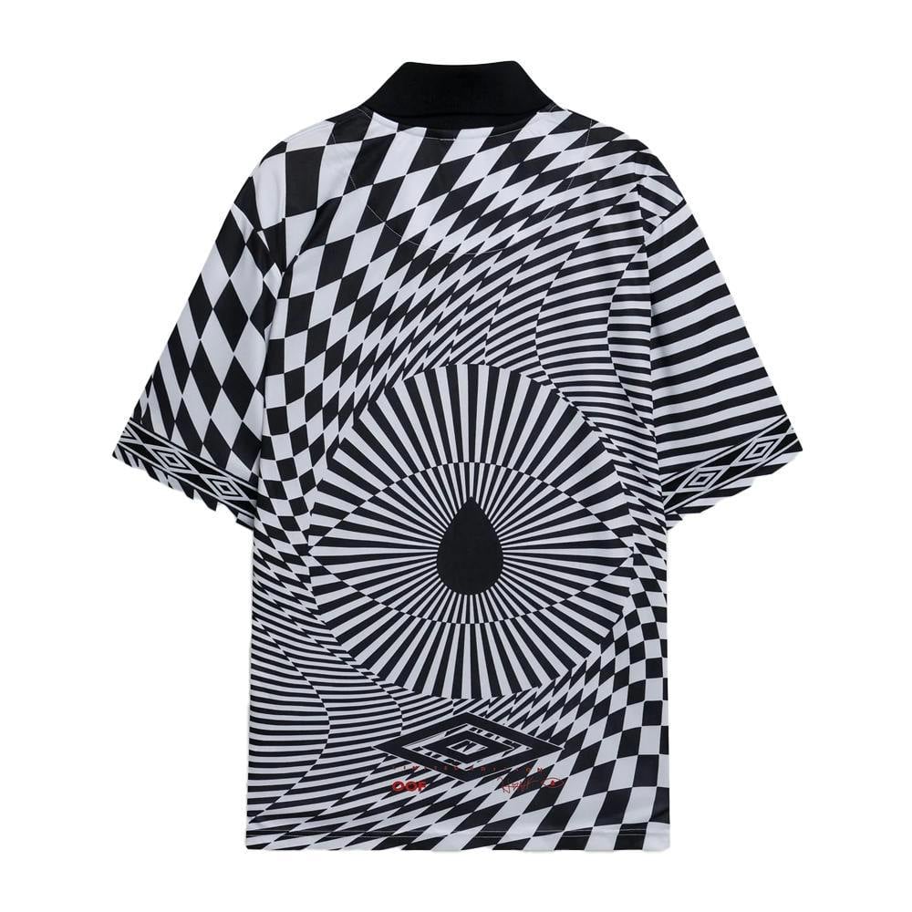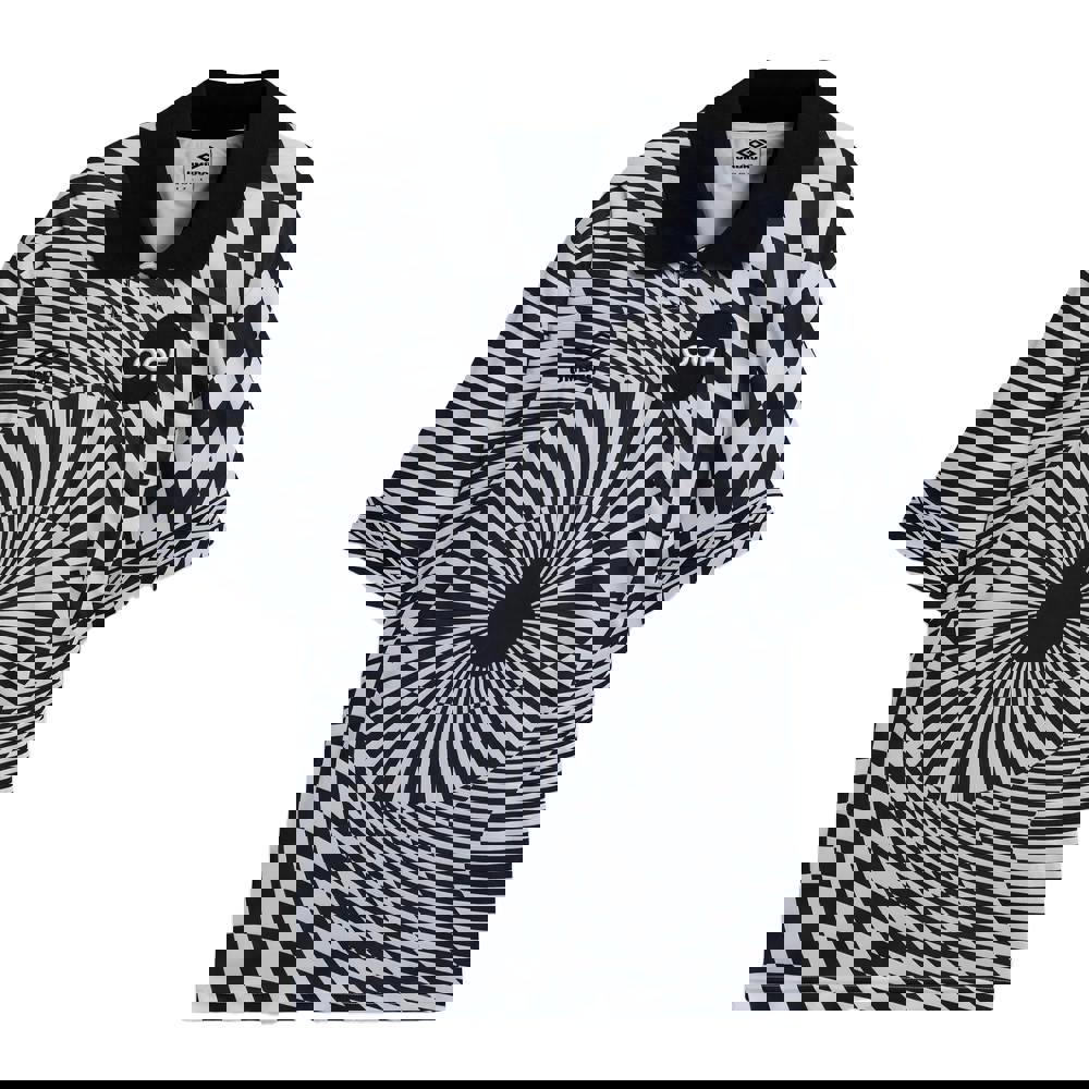 This unisex adult jersey from Umbro comes in white and black with a printed op art-inspired stripe design. It is made from 100% polyester interlock fabric with a 180gsm weight. A flat knit collar and short sleeves give it a clean, classic finish, while the one-button placket adds a simple fastening detail.