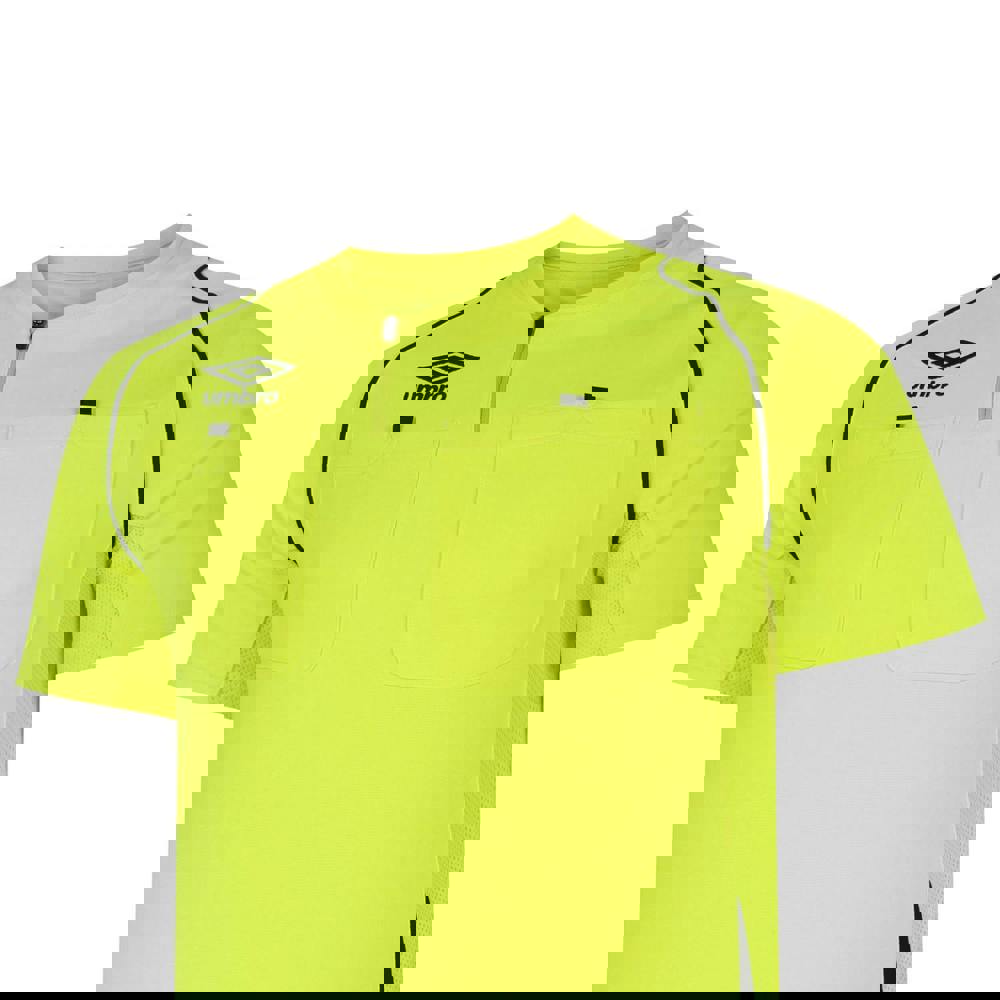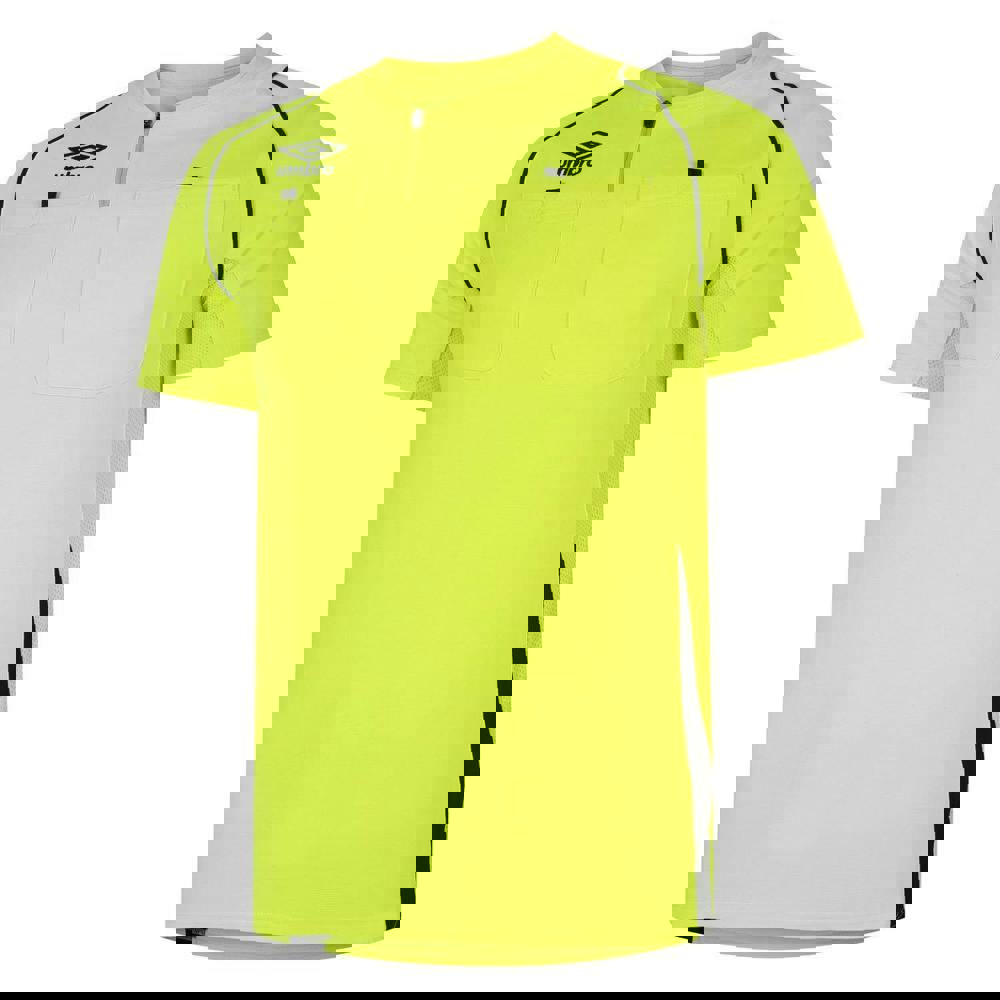 This unisex adult referee jersey from Umbro comes in safety yellow and black. It is made from 100% polyester and finished with an embellished logo detail. A crew neck and half zip fastening sit at the neckline, with a pull-over style for straightforward wear.