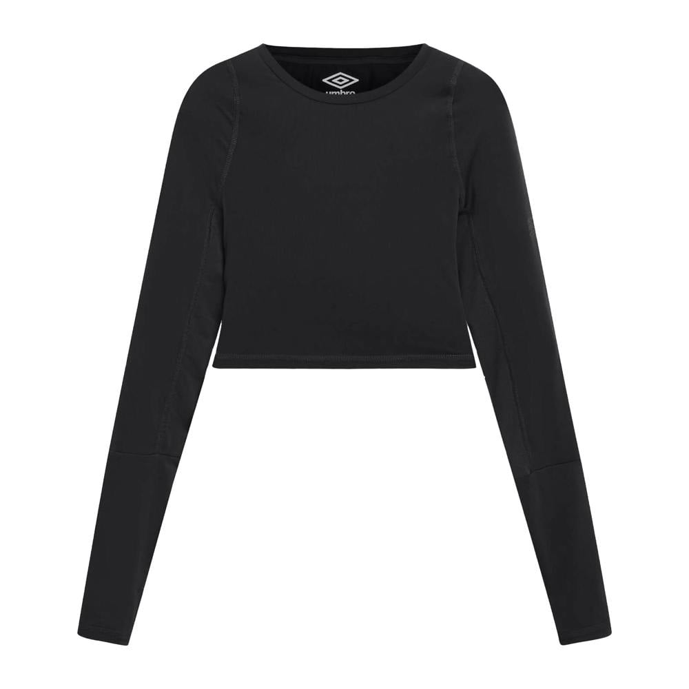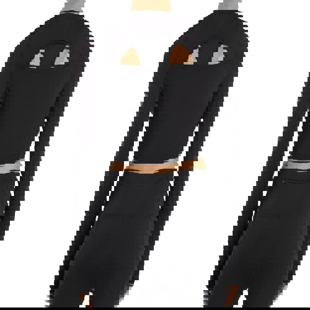 This long-sleeved training crop top is made from single jersey stretch material with 84% recycled polyester, 12% elastane and 4% polyester. It comes in black with a plain finish and logo detail, cut to a cropped length with a bodycon fit.