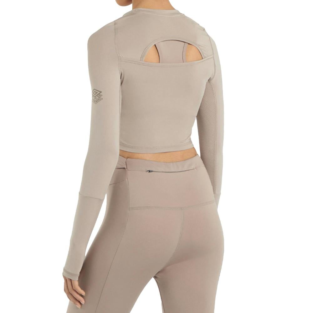 Cut to a cropped length with a bodycon fit, it includes a cut-out back and underarm mesh panels. Coverstitch detailing and thumb holes complete the design. Material weight: 150gsm.