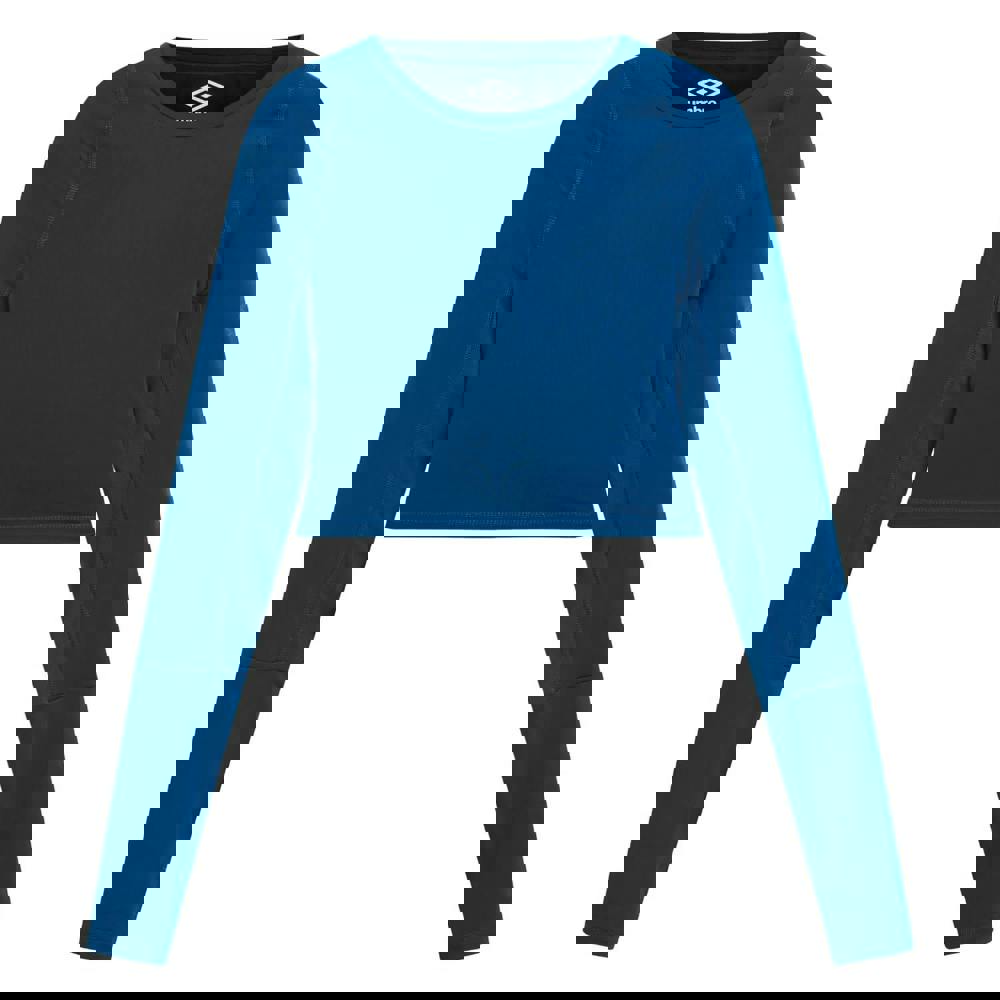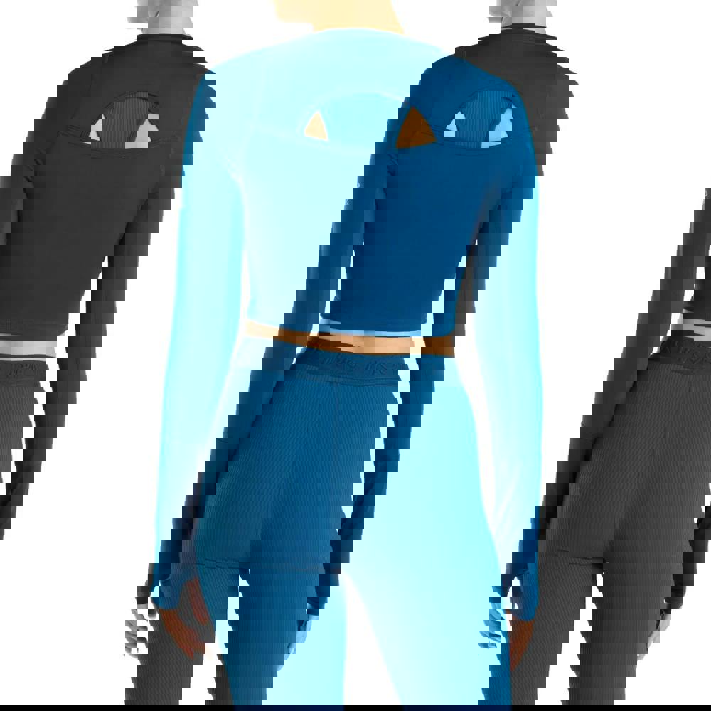 Cut to a cropped length with a bodycon fit, it includes raglan sleeves and a cut-out back style. Practical construction details include coverstitching, thumb holes and underarm mesh panels.