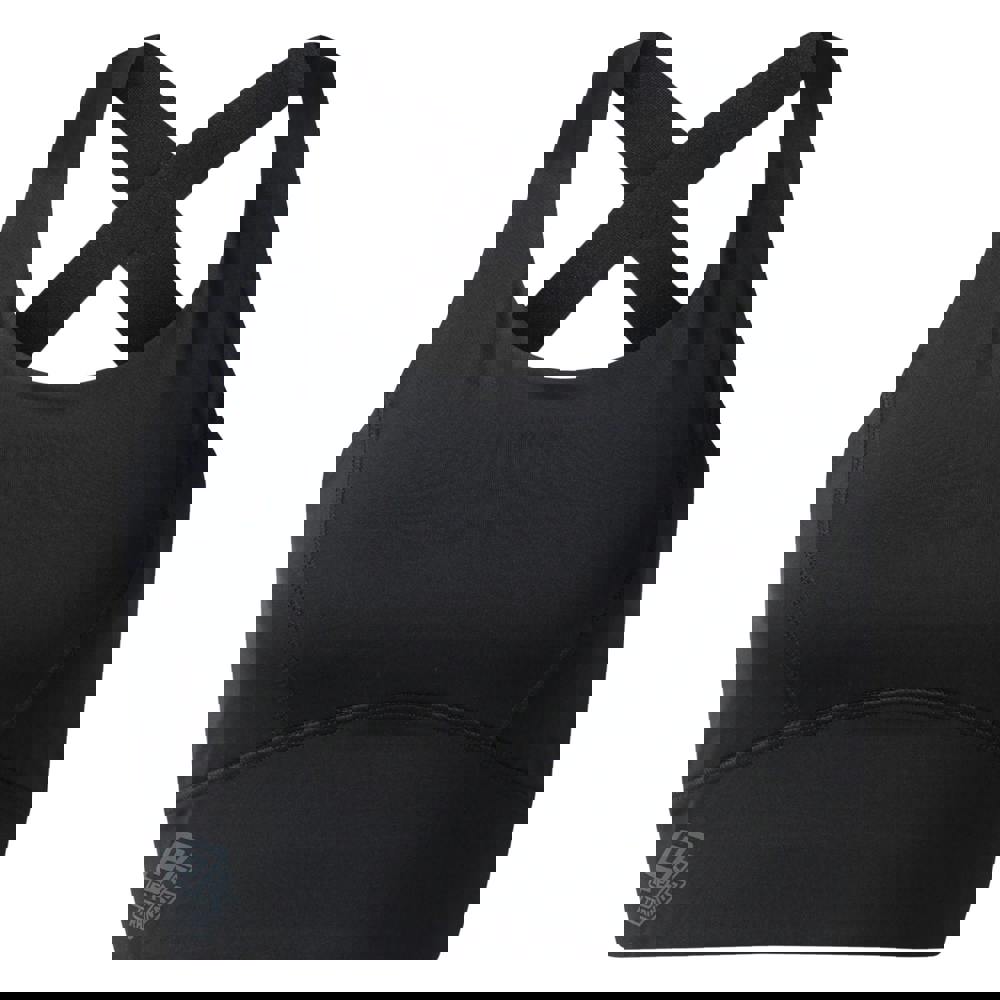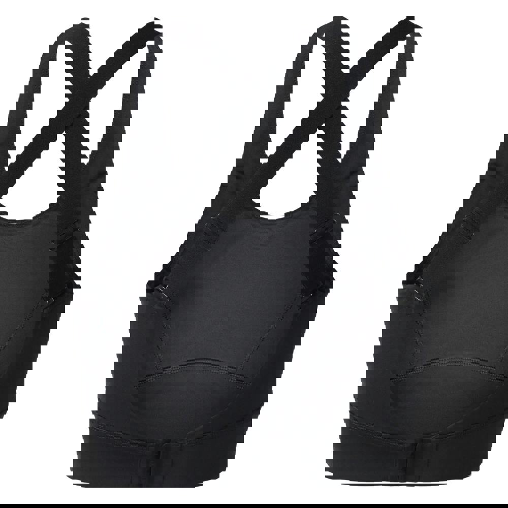 Details include an adjustable strap and a cross-strap back, finished with coverstitch and shaped side seams. A wide elasticated band adds structure, while removable cups and medium support offer adaptable wear. It fastens with a hook and eye closure and is cut with a scoop neckline.