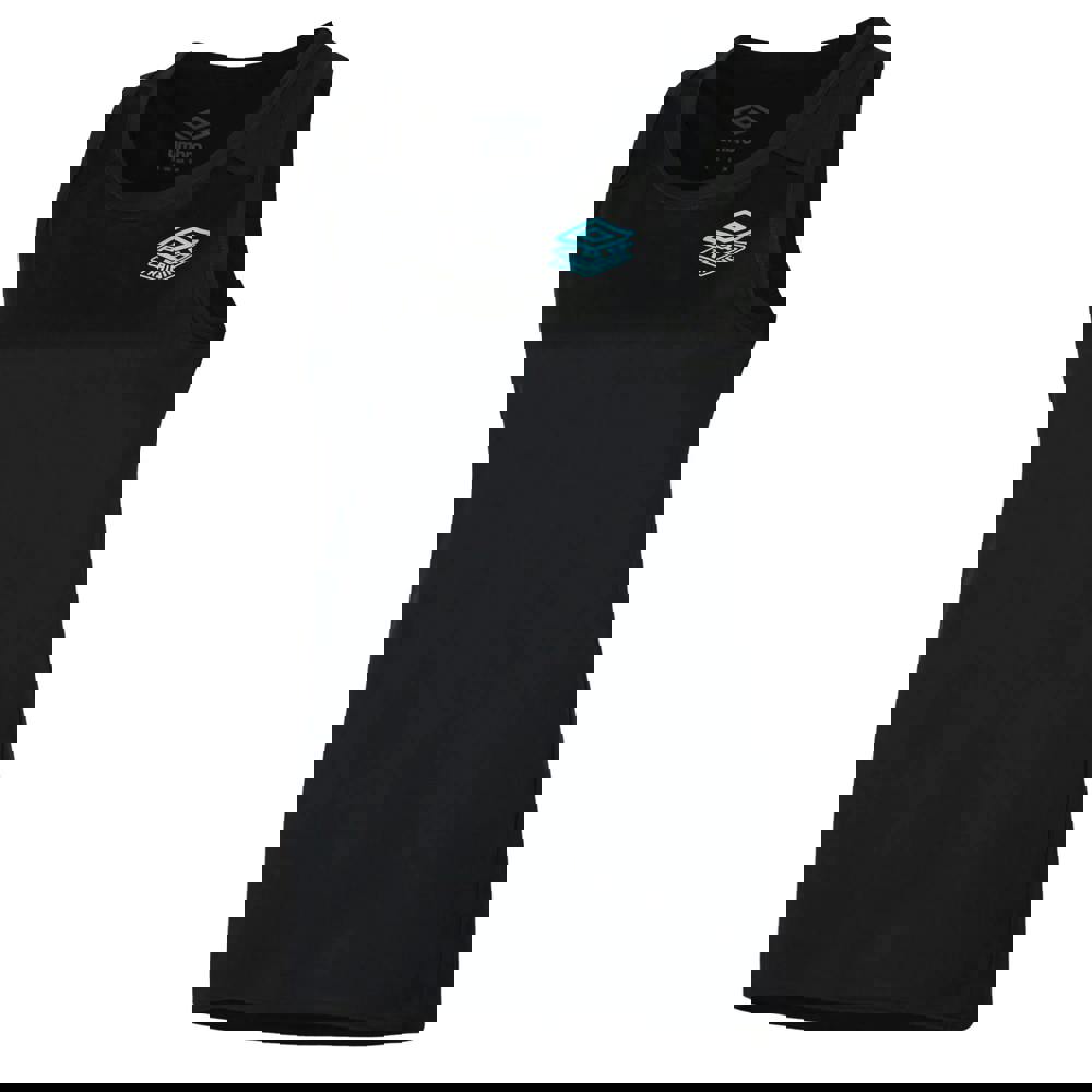 This racerback tank top from Umbro is made from 100% polyester with a micro eyelet finish. Cut in a sleeveless shape, it has a scoop neckline and a racerback for a clean, sporty look. Side panels add detail through the body, while the dropped, shaped hem creates a defined outline. Finished in black with a logo design, it works well for warm-weather wear and easy layering.