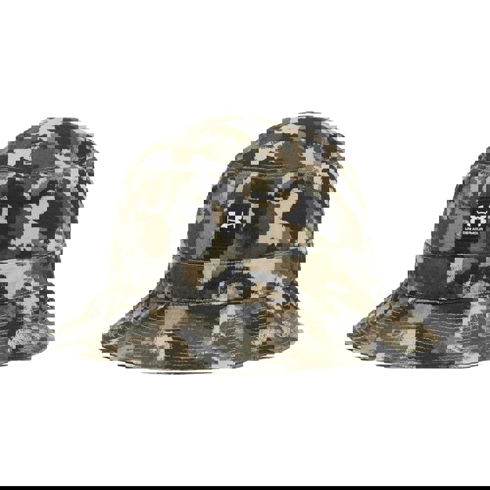 The Under Armour Essential Bucket Hat is a patterned bucket hat designed for everyday wear. Finished in Black/Stone with a camouflage design and logo detailing, it offers a distinctive look that pairs easily with casual outfits.