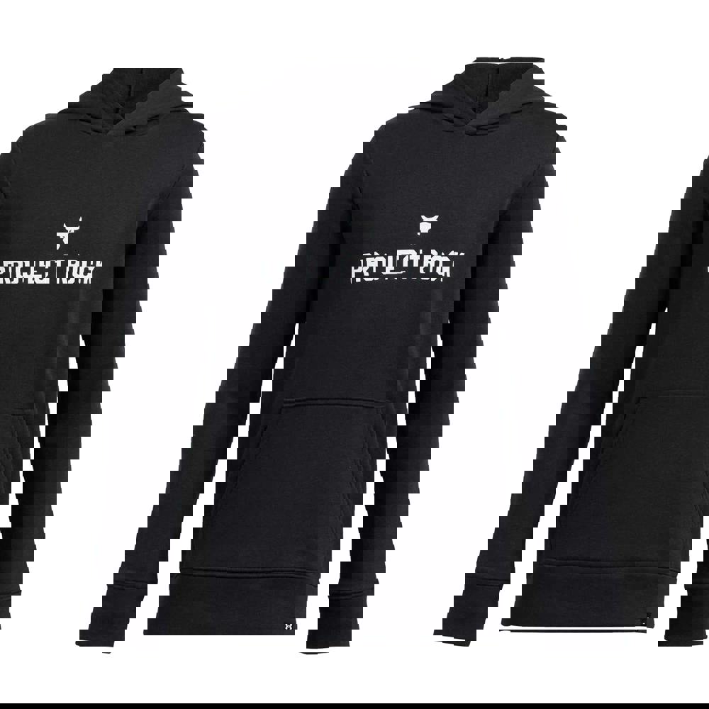 Under Armour Kids Project Rock Rival Hoodie in black, made from an 80% cotton and 20% polyester blend. The midweight fleece fabric has a soft handle and a hooded neckline with a drawcord for adjustment. A printed logo and back print add a bold finish.