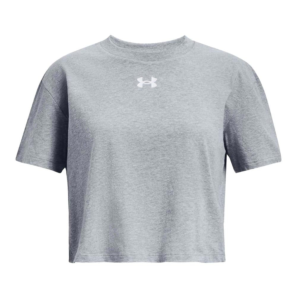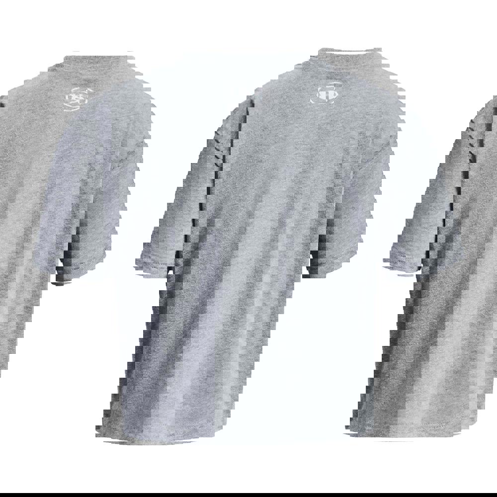 This Under Armour kids Sportstyle crop logo T-shirt comes in grey with a cotton blend fabric. It has a plain base with a logo and back print, finished with a crew neck and ribbed collar. Short sleeves and a drop shoulder shape sit with a loose fit, while the cropped length gives a modern silhouette.