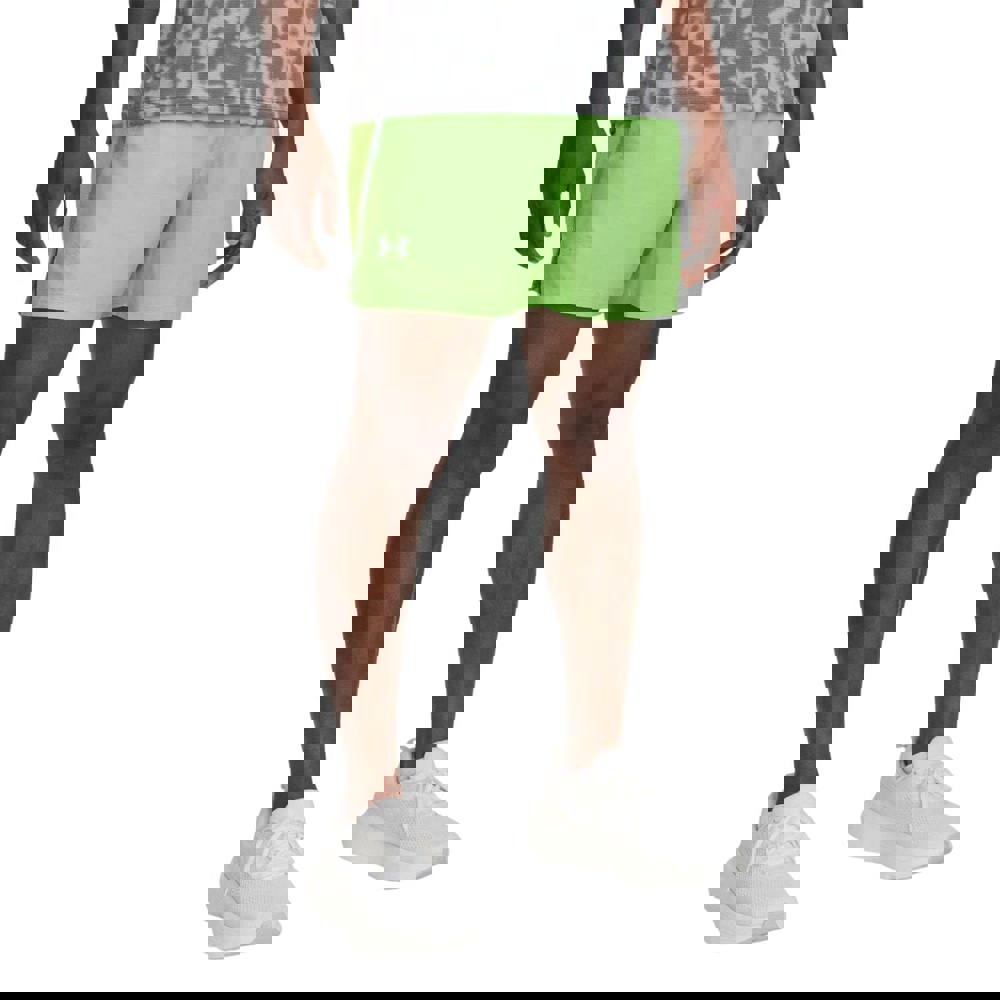 Under Armour Launch shorts in green are made from recycled polyester with a woven construction. The plain design is finished with a logo and reflective detail. Mesh lining and mesh panels add further structure, while the waistband combines a soft knit feel with an internal drawcord for adjustment.