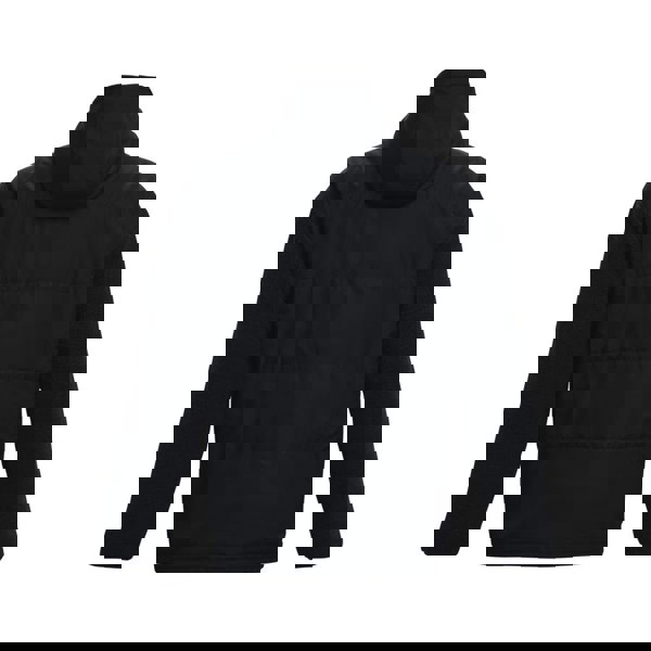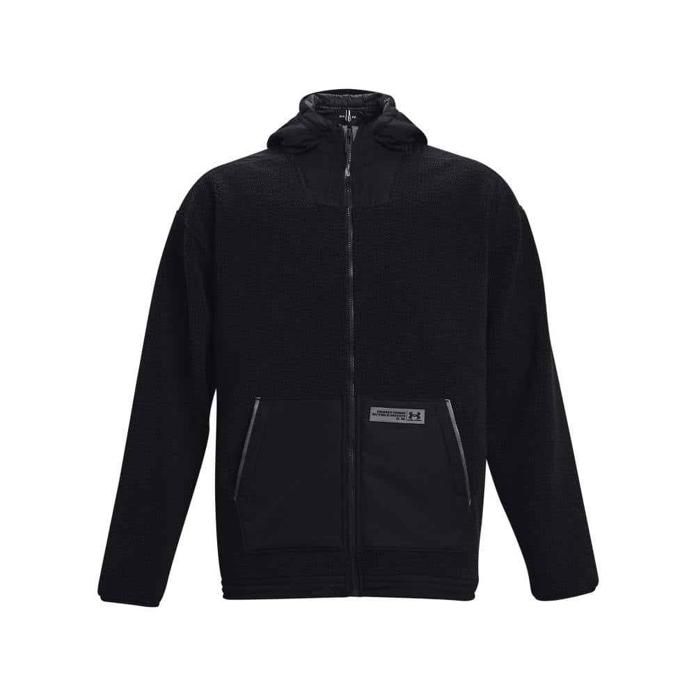 Under Armour Mission insulated jacket in black with a textured woven bouclé shell and soft-touch finish. The hooded neckline and long sleeves create a practical outer layer, while the loose fit allows easy movement and room for layering. Synthetic insulation is specified at 80gsm, and the fabric technology is listed as durable, insulating and water resistant.