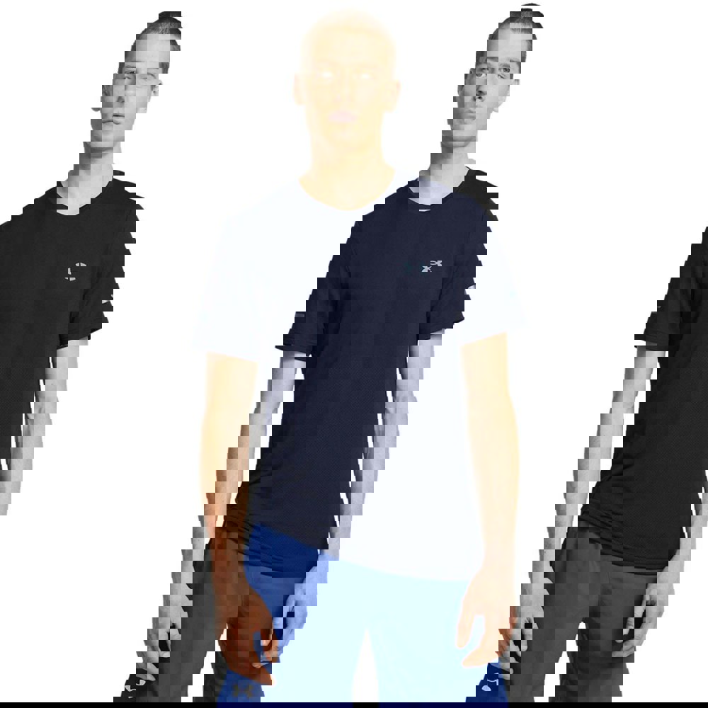 Under Armour SeamleStride T-shirt in navy, made from a 64% nylon and 36% polyester blend. The knitted, soft-touch fabric is finished with a logo design and a classic crew neckline. Short sleeves keep the silhouette clean and simple.