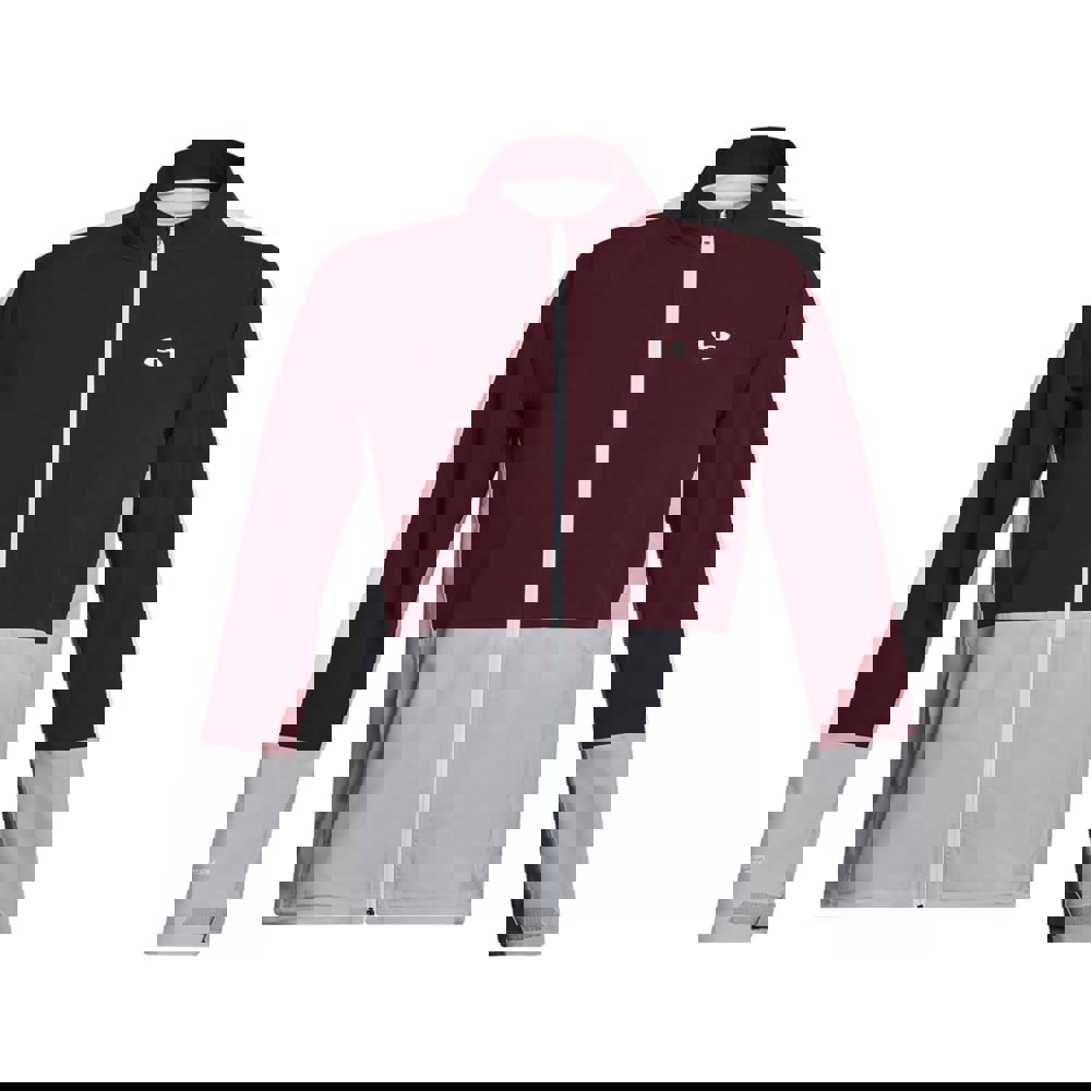 This long-sleeved jacket is made from recycled nylon with a bonded, double-layer fabric. It has a colour block design with logo detailing, finished in maroon red. The fabric technology is breathable, waterproof and windproof, with taped seams for added protection.