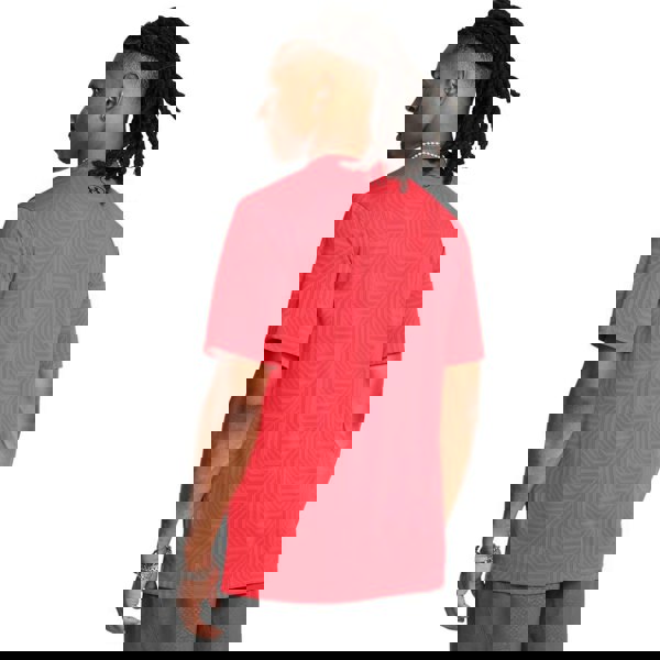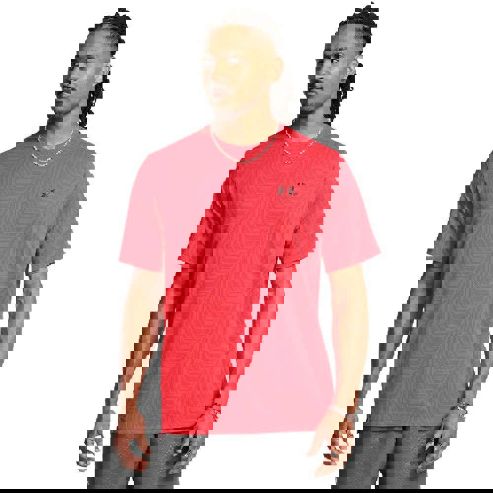 Under Armour Tech Geotessa Vent T-shirt in red, made from 100% polyester. The fabric uses a 4 way stretch jacquard with a soft touch finish, paired with mesh panels for added ventilation. A crew neck and short sleeves keep the silhouette clean and easy to wear.